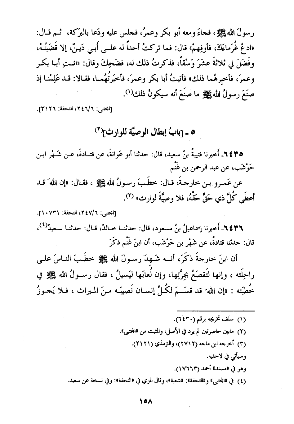 6435 - أَخْبَرَنَا قُتَيْبَةُ بْنُ سَعِيدٍ، قَالَ: حَدَّثَنَا أَبُو عَوَانَةَ، عَنْ قَتَادَةَ، عَنْ شَهْرِ بْنِ حَوْشَبٍ، عَنْ عَبْدِ الرَّحْمَنِ بْنِ غَنْمٍ، عَنْ عَمْرِو بْنِ خَارِجَةَ، قَالَ: خَطَبَ رَسُولُ اللهِ صَلَّى اللهُ عَلَيْهِ وَسَلَّمَ فَقَالَ: «إِنَّ §اللهَ قَدْ أَعْطَى كُلَّ ذِي حَقٍّ حَقَّهُ، فَلَا وَصِيَّةَ لِوَارِثٍ»
