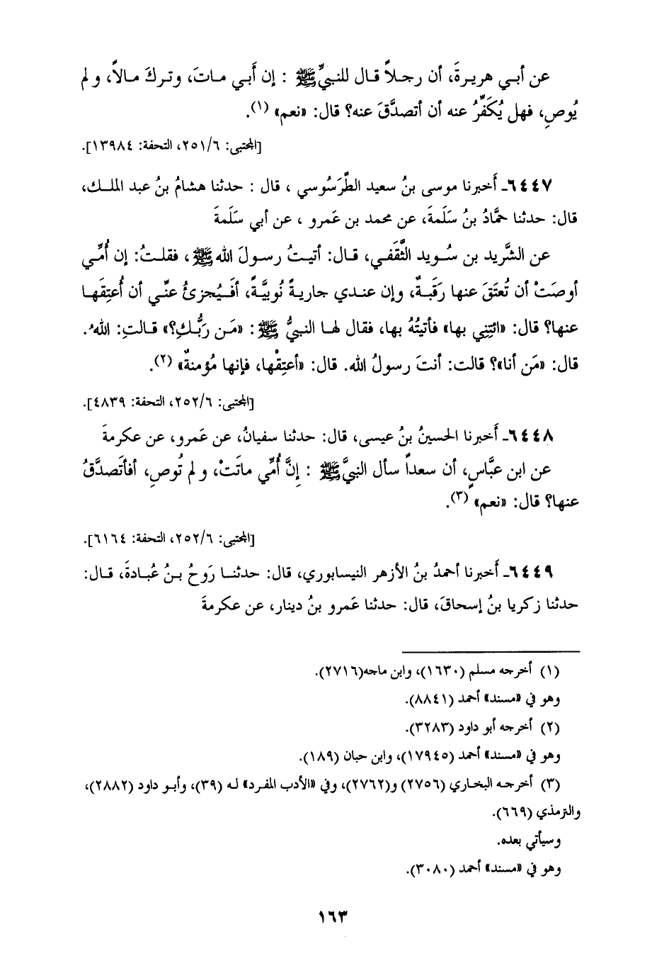 6447 - أَخْبَرَنَا مُوسَى بْنُ سَعِيدٍ الطَّرْسُوسِيُّ، قَالَ: حَدَّثَنَا هِشَامُ بْنُ عَبْدِ الْمَلِكِ، قَالَ: حَدَّثَنَا حَمَّادُ بْنُ سَلَمَةَ، عَنْ مُحَمَّدِ بْنِ عَمْرٍو، عَنْ أَبِي سَلَمَةَ، عَنِ الشَّرِيدِ بْنِ سُوَيْدٍ الثَّقَفِيِّ، قَالَ: أَتَيْتُ رَسُولَ اللهِ صَلَّى اللهُ عَلَيْهِ وَسَلَّمَ، فَقُلْتُ: إِنَّ §أُمِّي أَوْصَتْ أَنْ تَعْتِقَ عَنْهَا رَقَبَةً، وَإِنَّ عِنْدِي جَارِيَةً نُوبِيَّةً، أَفَيُجْزِئُ عَنِّي أَنْ أَعْتِقَهَا عَنْهَا؟، قَالَ: «ائْتِنِي بِهَا»، فَأَتَيْتُهُ بِهَا، فَقَالَ لَهَا النَّبِيُّ صَلَّى اللهُ عَلَيْهِ وَسَلَّمَ: «مَنْ رَبُّكِ؟»، قَالَتِ: اللهُ، قَالَ: «مَنْ أَنَا؟»، قَالَتْ: أَنْتَ رَسُولُ اللهِ، قَالَ: «أَعْتِقْهَا، فَإِنَّهَا مُؤْمِنَةٌ»