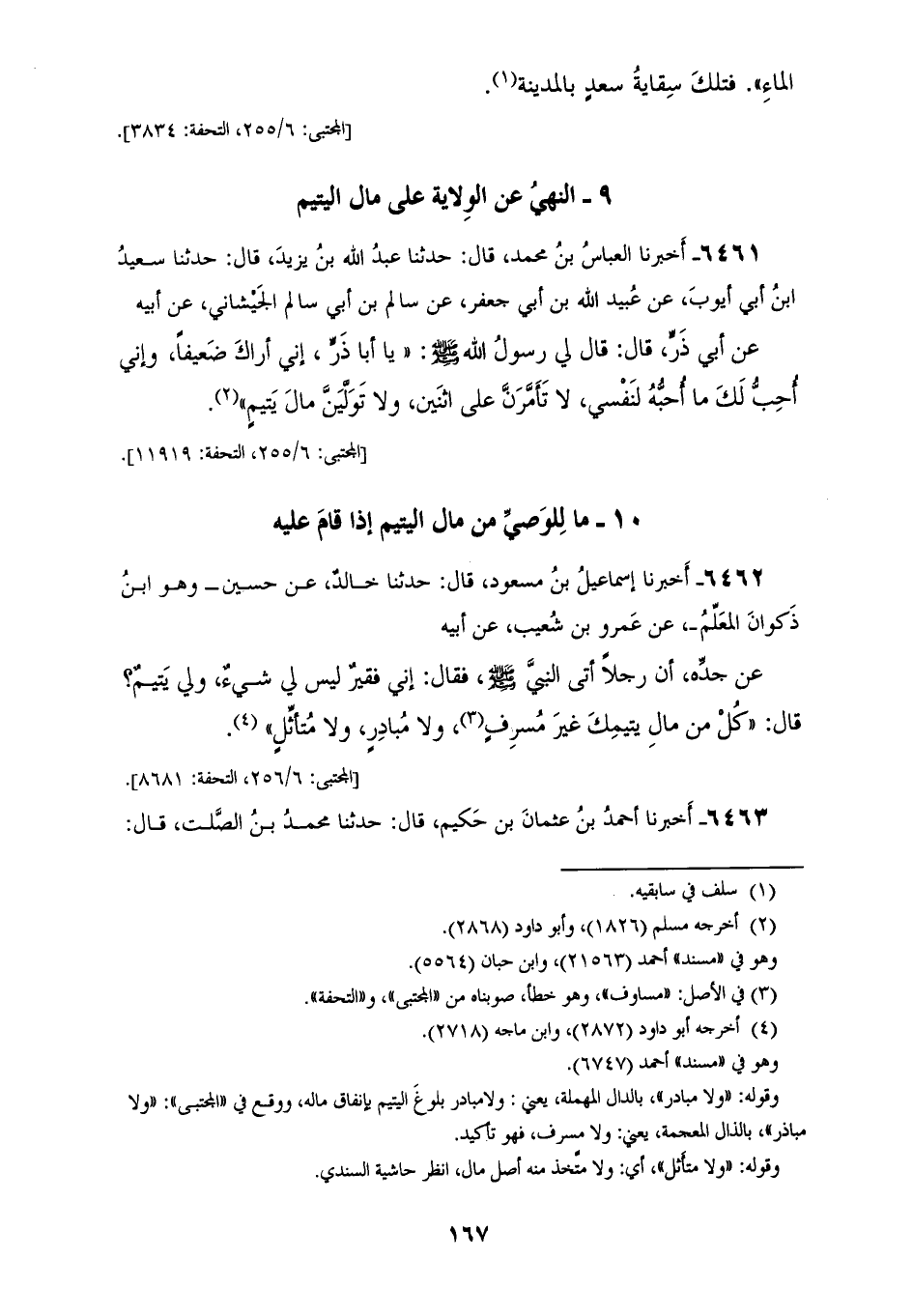 6462 - أَخْبَرَنَا إِسْمَاعِيلُ بْنُ مَسْعُودٍ، قَالَ: حَدَّثَنَا خَالِدٌ، عَنْ حُسَيْنٍ وَهُوَ ابْنُ ذَكْوَانَ الْمُعَلِّمُ، عَنْ عَمْرِو بْنِ شُعَيْبٍ، عَنْ أَبِيهِ، عَنْ جَدِّهِ، أَنَّ رَجُلًا، أَتَى النَّبِيَّ صَلَّى اللهُ عَلَيْهِ وَسَلَّمَ، فَقَالَ: إِنِّي فَقِيرٌ لَيْسَ لِي شَيْءٌ، وَلِي يَتِيمٌ، قَالَ: «§كُلْ مِنْ مَالِ يَتِيمِكَ غَيْرَ مُسْرِفٍ، وَلَا مُبَادِرٍ، وَلَا مُتَأَثِّلٍ»