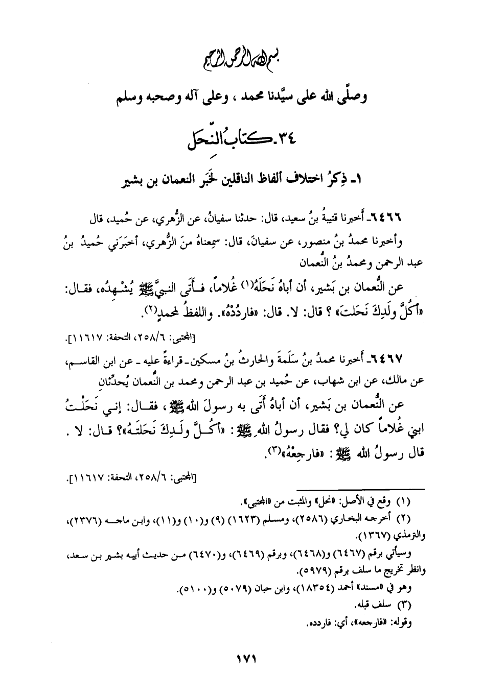 6466 - أَخْبَرَنَا قُتَيْبَةُ بْنُ سَعِيدٍ، قَالَ: حَدَّثَنَا سُفْيَانُ، عَنِ الزُّهْرِيِّ، عَنْ حُمَيْدٍ، قَالَ: وَأَخْبَرَنَا مُحَمَّدُ بْنُ مَنْصُورٍ، عَنْ سُفْيَانَ، قَالَ: سَمِعْنَاهُ مِنَ الزُّهْرِيِّ، أَخْبَرَنِي حُمَيْدُ بْنُ عَبْدِ الرَّحْمَنِ، وَمُحَمَّدُ بْنُ النُّعْمَانِ، عَنِ النُّعْمَانِ بْنِ بَشِيرٍ، أَنَّ أَبَاهُ نَحَلَهُ غُلَامًا، فَأَتَى النَّبِيَّ صَلَّى اللهُ عَلَيْهِ وَسَلَّمَ يُشْهِدُهُ، فَقَالَ: «§أَكُلَّ وَلَدِكَ نَحَلْتَ؟»، قَالَ: لَا، قَالَ: «فَارْدُدْهُ». وَاللَّفْظُ لِمُحَمَّدٍ