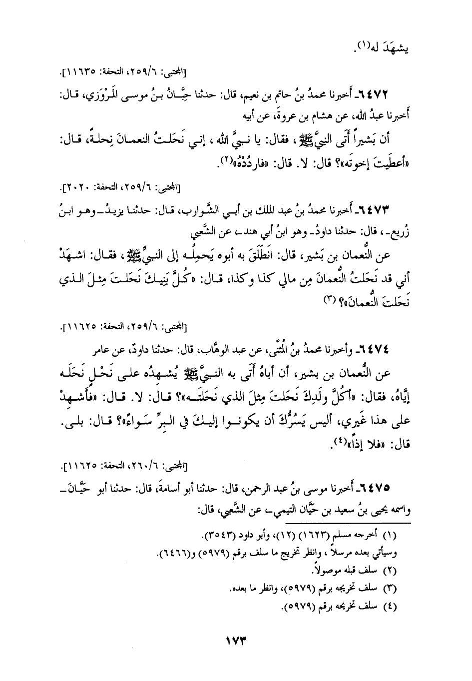 6473 - أَخْبَرَنَا مُحَمَّدُ بْنُ عَبْدِ الْمَلِكِ بْنِ أَبِي الشَّوَارِبِ، قَالَ: حَدَّثَنَا يَزِيدُ وَهُوَ ابْنُ زُرَيْعٍ، قَالَ: حَدَّثَنَا دَاوُدُ وَهُوَ ابْنُ أَبِي هِنْدٍ، عَنِ الشَّعْبِيِّ، عَنِ النُّعْمَانِ بْنِ بَشِيرٍ، قَالَ: انْطَلَقَ بِهِ أَبُوهُ، يَحْمِلُهُ إِلَى النَّبِيِّ صَلَّى اللهُ عَلَيْهِ وَسَلَّمَ، فَقَالَ: اشْهَدْ أَنِّي قَدْ نَحَلْتُ النُّعْمَانَ مِنْ مَالِي كَذَا وَكَذَا، قَالَ: «§كُلَّ بَنِيكَ نَحَلْتَ مِثْلَ الَّذِي نَحَلْتَ النُّعْمَانَ؟»