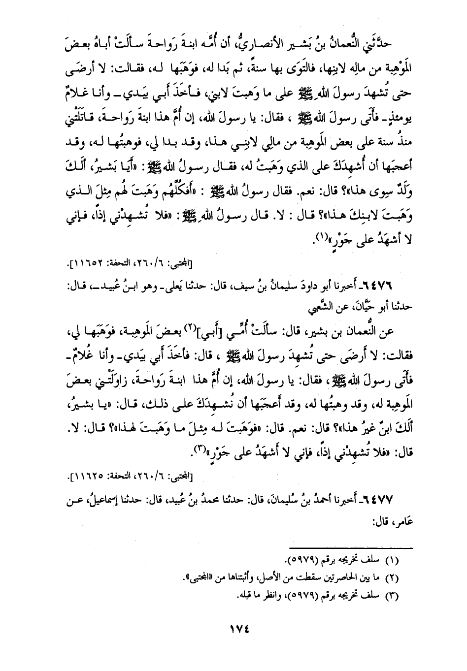 6476 - أَخْبَرَنَا أَبُو دَاوُدَ سُلَيْمَانُ بْنُ سَيْفٍ، قَالَ: حَدَّثَنَا يَعْلَى وَهُوَ ابْنُ عُبَيْدٍ، قَالَ: حَدَّثَنَا أَبُو حَيَّانَ، عَنِ الشَّعْبِيِّ، عَنِ النُّعْمَانِ بْنِ بَشِيرٍ، قَالَ: سَأَلَتْ أُمِّي أَبِي بَعْضَ الْمَوْهِبَةِ، فَوَهَبَهَا لِي، فَقَالَتْ: لَا أَرْضَى حَتَّى تُشْهِدَ رَسُولَ اللهِ صَلَّى اللهُ عَلَيْهِ وَسَلَّمَ، قَالَ: فَأَخَذَ أَبِي بِيَدِي، وَأَنَا غُلَامٌ، فَأَتَى رَسُولَ اللهِ صَلَّى اللهُ عَلَيْهِ وَسَلَّمَ، فَقَالَ: يَا رَسُولَ اللهِ، إِنَّ §أُمَّ هَذَا ابْنَةَ رَوَاحَةَ زَاوَلَتْنِي بَعْضَ الْمَوْهِبَةِ لَهُ، وَقَدْ وَهَبْتُهَا لَهُ وَقَدْ أَعْجَبَهَا أَنْ نُشْهِدَكَ عَلَى ذَلِكَ، قَالَ: «يَا بَشِيرُ، أَلَكَ ابْنٌ غَيْرُ هَذَا؟»، قَالَ: نَعَمْ، قَالَ: «فَوَهَبْتَ لَهُ مِثْلَ مَا وَهَبْتَ لِهَذَا؟»، قَالَ: لَا، قَالَ: «فَلَا تُشْهِدْنِي إِذًا، فَإِنِّي لَا أَشْهَدُ عَلَى جَوْرٍ»
