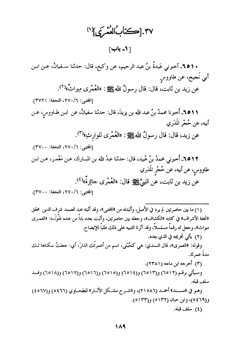 6510 - أَخْبَرَنِي عَبْدَةُ بْنُ عَبْدِ الرَّحِيمِ، عَنْ وَكِيعٍ، قَالَ: حَدَّثَنَا سُفْيَانُ، عَنِ ابْنِ أَبِي نَجِيحٍ، عَنْ طَاوُسٍ، عَنْ زَيْدِ بْنِ ثَابِتٍ، قَالَ: قَالَ رَسُولُ اللهِ صَلَّى اللهُ عَلَيْهِ وَسَلَّمَ: «§الْعُمْرَى مِيرَاثٌ»