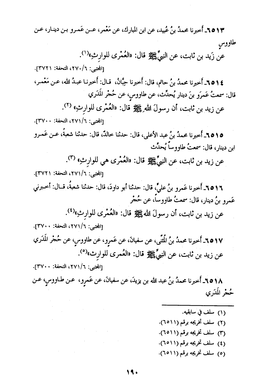 6517 - أَخْبَرَنَا مُحَمَّدُ بْنُ الْمُثَنَّى، عَنْ سُفْيَانَ، عَنْ عَمْرٍو، عَنْ طَاوُوسٍ، عَنْ حُجْرٍ الْمَدَرِيِّ، عَنْ زَيْدِ بْنِ ثَابِتٍ، عَنِ النَّبِيِّ صَلَّى اللهُ عَلَيْهِ وَسَلَّمَ، قَالَ: «§الْعُمْرَى لِلْوَارِثِ»