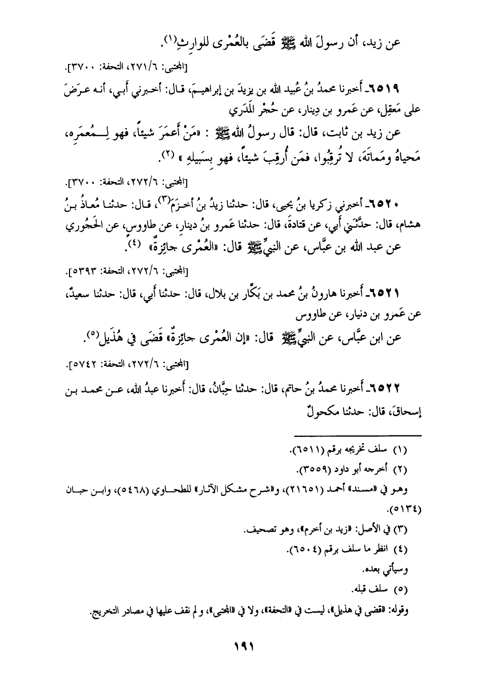 6522 - أَخْبَرَنَا مُحَمَّدُ بْنُ حَاتِمٍ، قَالَ: حَدَّثَنَا حِبَّانُ، قَالَ: أَخْبَرَنَا عَبْدُ اللهِ، عَنْ مُحَمَّدِ بْنِ إِسْحَاقَ، قَالَ: حَدَّثَنَا مَكْحُولٌ، عَنْ طَاوُسٍ، بَتَلَ رَسُولُ اللهِ صَلَّى اللهُ عَلَيْهِ وَسَلَّمَ: «§الْعُمْرَى، وَالرُّقْبَى»