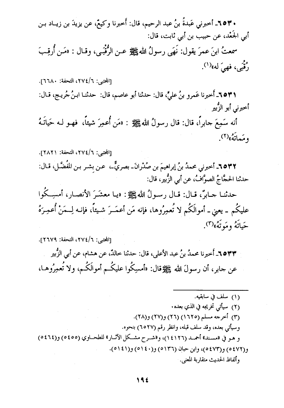 6533 - أَخْبَرَنَا مُحَمَّدُ بْنُ عَبْدِ الْأَعْلَى، قَالَ: حَدَّثَنَا خَالِدٌ، عَنْ هِشَامٍ، عَنْ أَبِي الزُّبَيْرِ، عَنْ جَابِرٍ أَنَّ رَسُولَ اللهِ صَلَّى اللهُ عَلَيْهِ وَسَلَّمَ قَالَ: «§امْسِكُوا عَلَيْكُمْ أَمْوَالَكُمْ، وَلَا تُعْمِرُوهَا، فَمَنْ أُعْمِرَ شَيْئًا حَيَاتَهُ فَهُوَ لَهُ حَيَاتَهُ، وَبَعْدَ مَوْتِهِ»