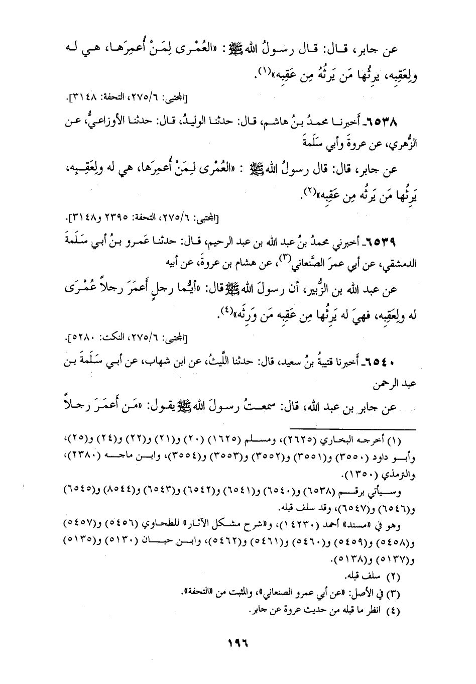 6538 - أَخْبَرَنَا مُحَمَّدُ بْنُ هَاشِمٍ، قَالَ: حَدَّثَنَا الْوَلِيدُ، قَالَ: حَدَّثَنَا الْأَوْزَاعِيُّ، عَنِ الزُّهْرِيِّ، عَنْ عُرْوَةَ، وَأَبِي سَلَمَةَ، عَنْ جَابِرٍ قَالَ: قَالَ رَسُولُ اللهِ صَلَّى اللهُ عَلَيْهِ وَسَلَّمَ: «§الْعُمْرَى لِمَنْ أُعْمِرَهَا، هِيَ لَهُ وَلِعَقِبِهِ، يَرِثُهَا مَنْ يَرِثُهُ مِنْ عَقِبِهِ»