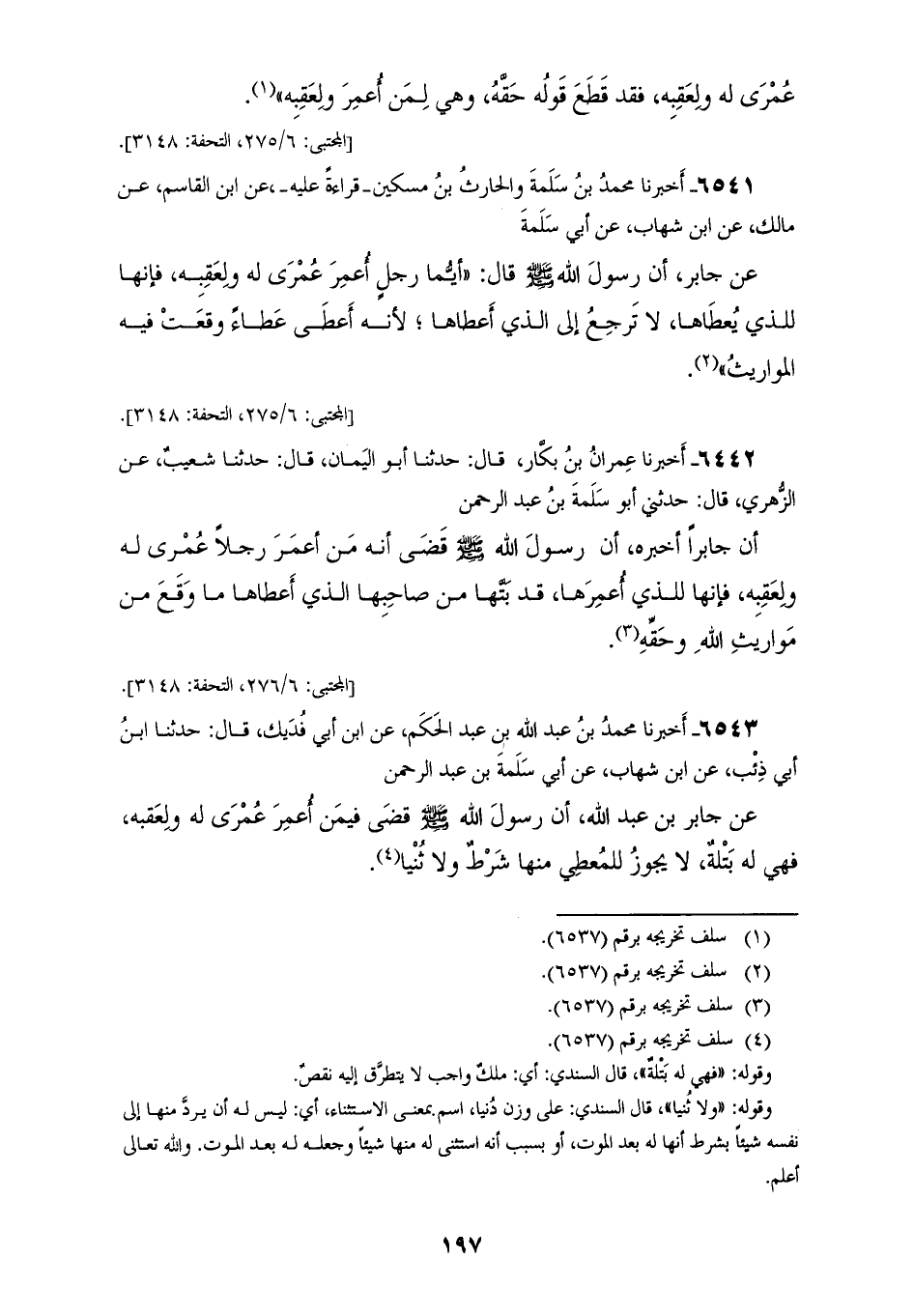 6543 - أَخْبَرَنَا مُحَمَّدُ بْنُ عَبْدِ اللهِ بْنِ عَبْدِ الْحَكَمِ، عَنِ ابْنِ أَبِي فُدَيْكٍ، قَالَ: حَدَّثَنَا ابْنُ أَبِي ذِئْبٍ، عَنِ ابْنِ شِهَابٍ، عَنْ أَبِي سَلَمَةَ بْنِ عَبْدِ الرَّحْمَنِ، عَنْ جَابِرِ بْنِ عَبْدِ اللهِ أَنَّ رَسُولَ اللهِ صَلَّى اللهُ عَلَيْهِ وَسَلَّمَ: «§قَضَى فِيمَنْ أُعْمِرَ عُمْرَى لَهُ وَلِعَقِبِهِ فَهِيَ لَهُ بَتْلَةٌ، لَا يَجُوزُ لِلْمُعْطِي مِنْهَا شَرْطٌ، وَلَا ثُنْيَا» قَالَ أَبُو سَلَمَةَ: لِأَنَّهُ أَعْطَى عَطَاءً وَقَعَتْ فِيهِ الْمَوَارِيثُ، فَقَطَعَتِ الْمَوَارِيثُ شَرْطَهُ