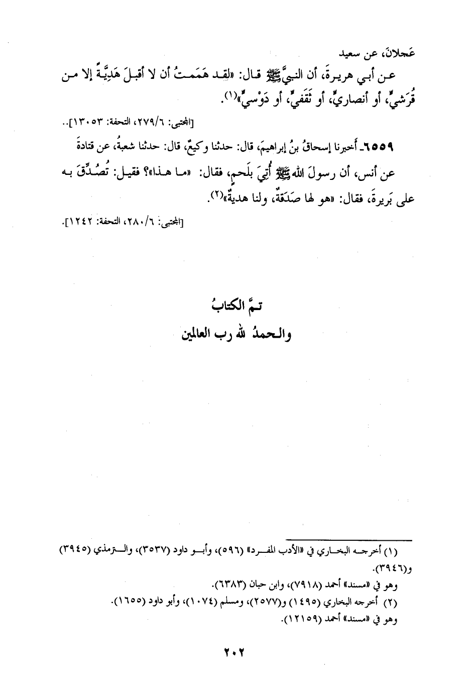 6558 - أَخْبَرَنَا أَبُو عَاصِمٍ، قَالَ: حَدَّثَنَا عَبْدُ الرَّزَّاقِ، قَالَ: أَخْبَرَنَا مَعْمَرٌ، عَنِ ابْنِ عَجْلَانَ، عَنْ سَعِيدٍ، عَنْ أَبِي هُرَيْرَةَ أَنَّ النَّبِيَّ صَلَّى اللهُ عَلَيْهِ وَسَلَّمَ قَالَ: «§لَقَدْ هَمَمْتُ أَنْ لَا أَقْبَلَ هَدِيَّةً إِلَّا مِنْ قُرَشِيٍّ، أَوْ أَنْصَارِيٍّ، أَوْ ثَقَفِيٍّ، أَوْ دَوْسِيٍّ»