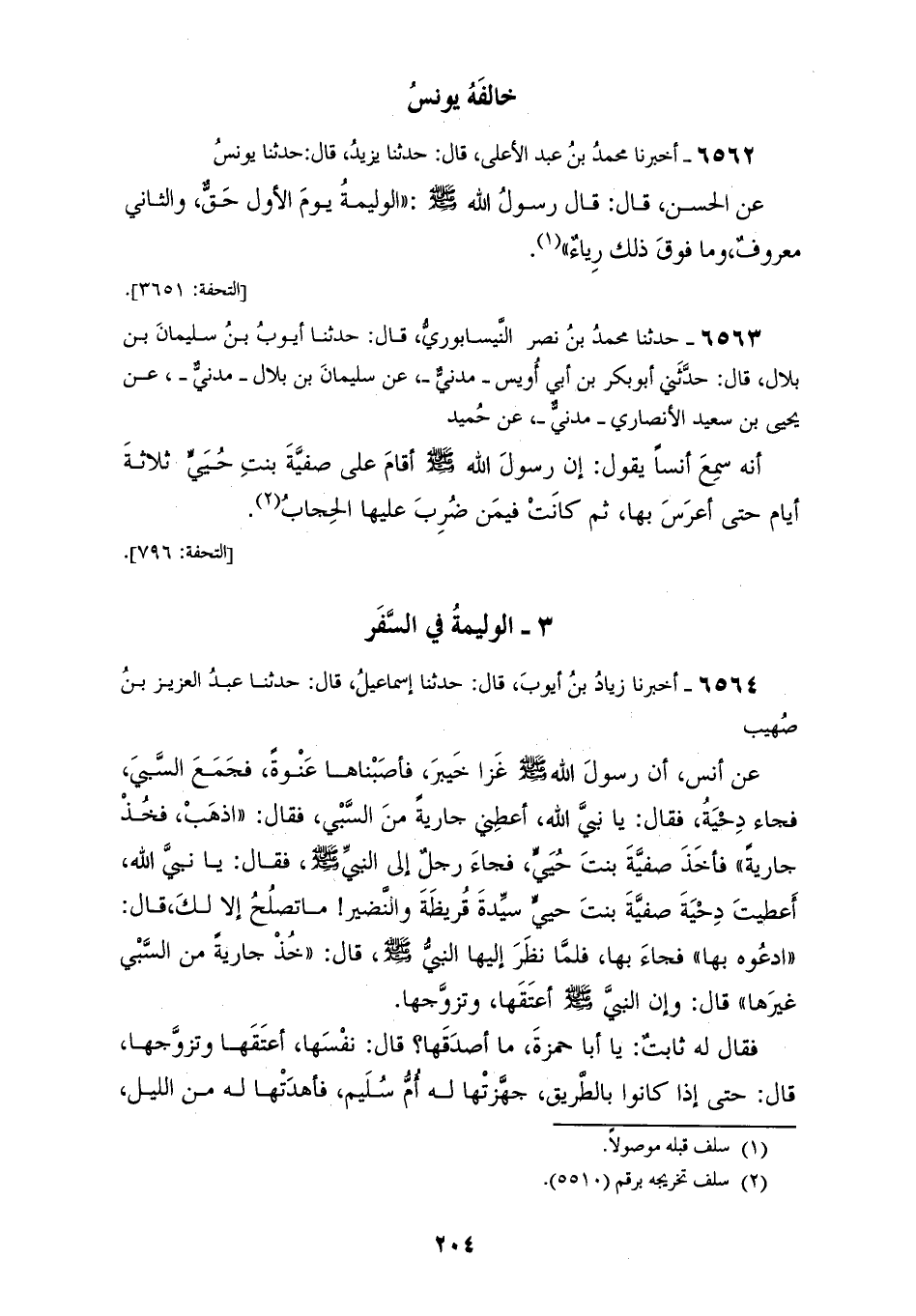 6563 - حَدَّثَنَا مُحَمَّدُ بْنُ نَصْرٍ النَّيْسَابُورِيُّ، قَالَ: حَدَّثَنَا أَيُّوبُ بْنُ سُلَيْمَانَ بْنِ بِلَالٍ، قَالَ: حَدَّثَنِي أَبُو بَكْرِ بْنُ أَبِي أُوَيْسٍ مَدَنِيٌّ، عَنْ سُلَيْمَانَ بْنِ بِلَالٍ، مَدَنِيٌّ، عَنْ يَحْيَى بْنِ سَعِيدٍ الْأَنْصَارِيِّ مَدَنِيٌّ، عَنْ حُمَيْدٍ، أَنَّهُ سَمِعَ أَنَسًا، يَقُولُ: «إِنَّ §رَسُولَ اللهِ صَلَّى اللهُ عَلَيْهِ وَسَلَّمَ أَقَامَ عَلَى صَفِيَّةَ بِنْتِ حُيَيٍّ ثَلَاثَةَ أَيَّامٍ حَتَّى أَعْرَسَ بِهَا، ثُمَّ كَانَتْ فِيمَنْ ضُرِبَ عَلَيْهَا الْحِجَابُ»