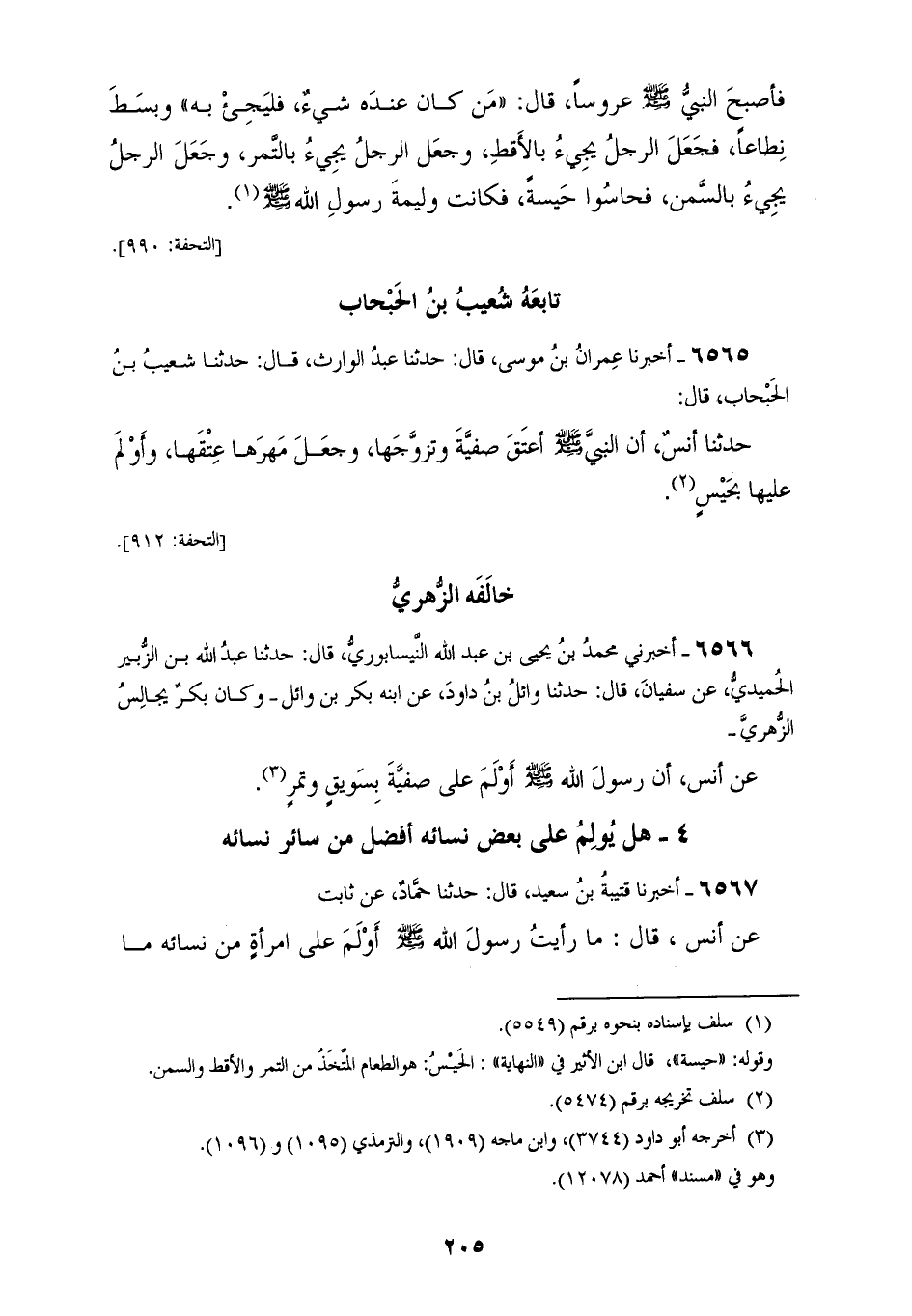 6566 - أَخْبَرَنِي مُحَمَّدُ بْنُ يَحْيَى بْنِ عَبْدِ اللهِ النَّيْسَابُورِيُّ قَالَ: حَدَّثَنَا عَبْدُ اللهِ بْنُ الزُّبَيْرِ الْحُمَيْدِيُّ، عَنْ سُفْيَانَ، قَالَ: حَدَّثَنَا وَائِلُ بْنُ دَاوُدَ، عَنِ ابِنْهِ بَكْرِ بْنِ وَائِلٍ، وَكَانَ بَكْرٌ يُجَالِسُ الزُّهْرِيَّ، عَنْ أَنَسٍ أَنَّ رَسُولَ اللهِ صَلَّى اللهُ عَلَيْهِ وَسَلَّمَ: «§أَوْلَمَ عَلَى صَفِيَّةَ بِسَوِيقٍ وَتَمْرٍ»
