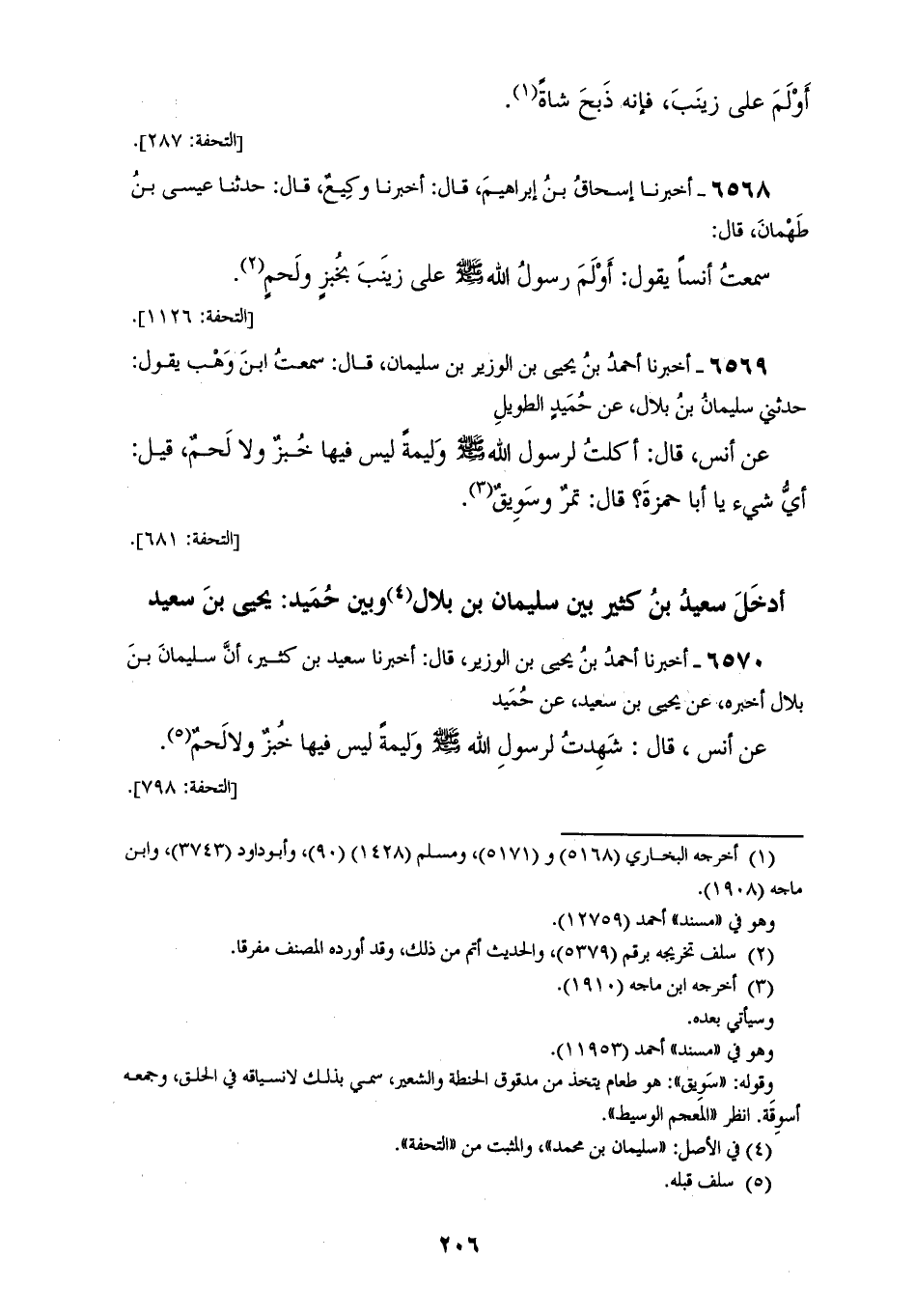 6569 - أَخْبَرَنَا أَحْمَدُ بْنُ يَحْيَى بْنِ الْوَزِيرِ بْنِ سُلَيْمَانَ، قَالَ: سَمِعْتُ ابْنُ وَهْبٍ، يَقُولُ: حَدَّثَنِي سُلَيْمَانُ بْنُ بِلَالٍ، عَنْ حُمَيْدٍ الطَّوِيلِ عَنْ أَنَسٍ، قَالَ: «§أَكَلْتُ لِرَسُولِ اللهِ صَلَّى اللهُ عَلَيْهِ وَسَلَّمَ وَلِيمَةً، لَيْسَ فِيهَا خُبْزٌ وَلَا لَحْمٌ» قِيلَ: أَيُّ شَيْءٍ يَا أَبَا حَمْزَةَ، قَالَ: تَمْرٌ وَسَوِيقٌ ". أَدْخَلَ سَعِيدُ بْنُ كَثِيرِ، بَيْنَ سُلَيْمَانَ بَنِ بِلَالٍ، وَبَيْنَ حُمَيْدٍ يَحْيَى بْنَ سَعِيدٍ