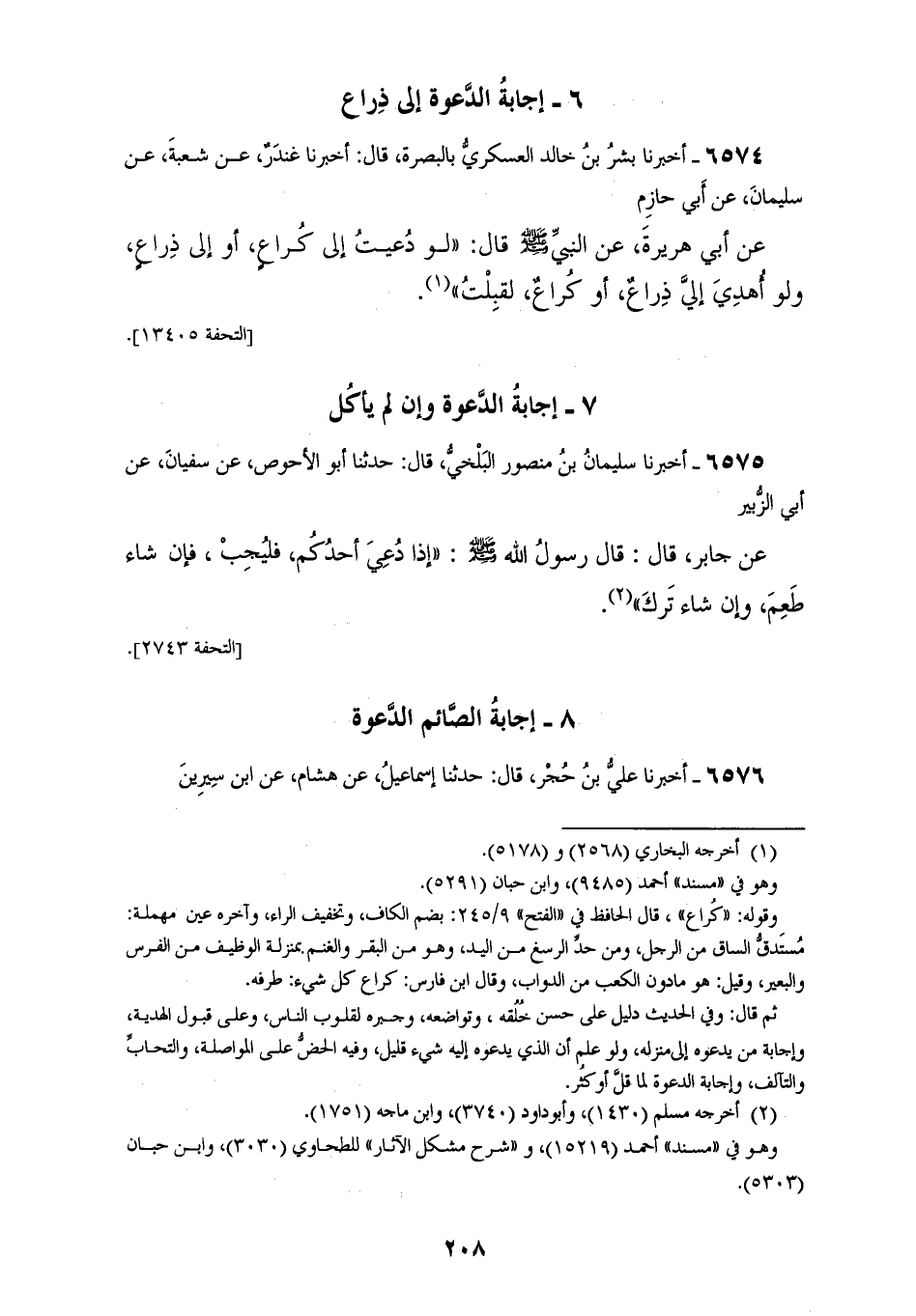6574 - أَخْبَرَنَا بِشْرُ بْنُ خَالِدٍ الْعَسْكَرِيُّ بِالْبَصْرَةِ، قَالَ: أَخْبَرَنَا غُنْدَرٌ، عَنْ شُعْبَةَ، عَنْ سُلَيْمَانَ، عَنْ أَبِي حَازِمٍ، عَنْ أَبِي هُرَيْرَةَ، عَنِ النَّبِيِّ صَلَّى اللهُ عَلَيْهِ وَسَلَّمَ، قَالَ: «§لَوْ دُعِيتُ إِلَى كُرَاعٍ، أَوْ إِلَى ذِرَاعٍ، وَلَوْ أُهْدِيَ إِلَيَّ ذِرَاعٌ، أَوْ كُرَاعٌ لَقَبِلْتُ»