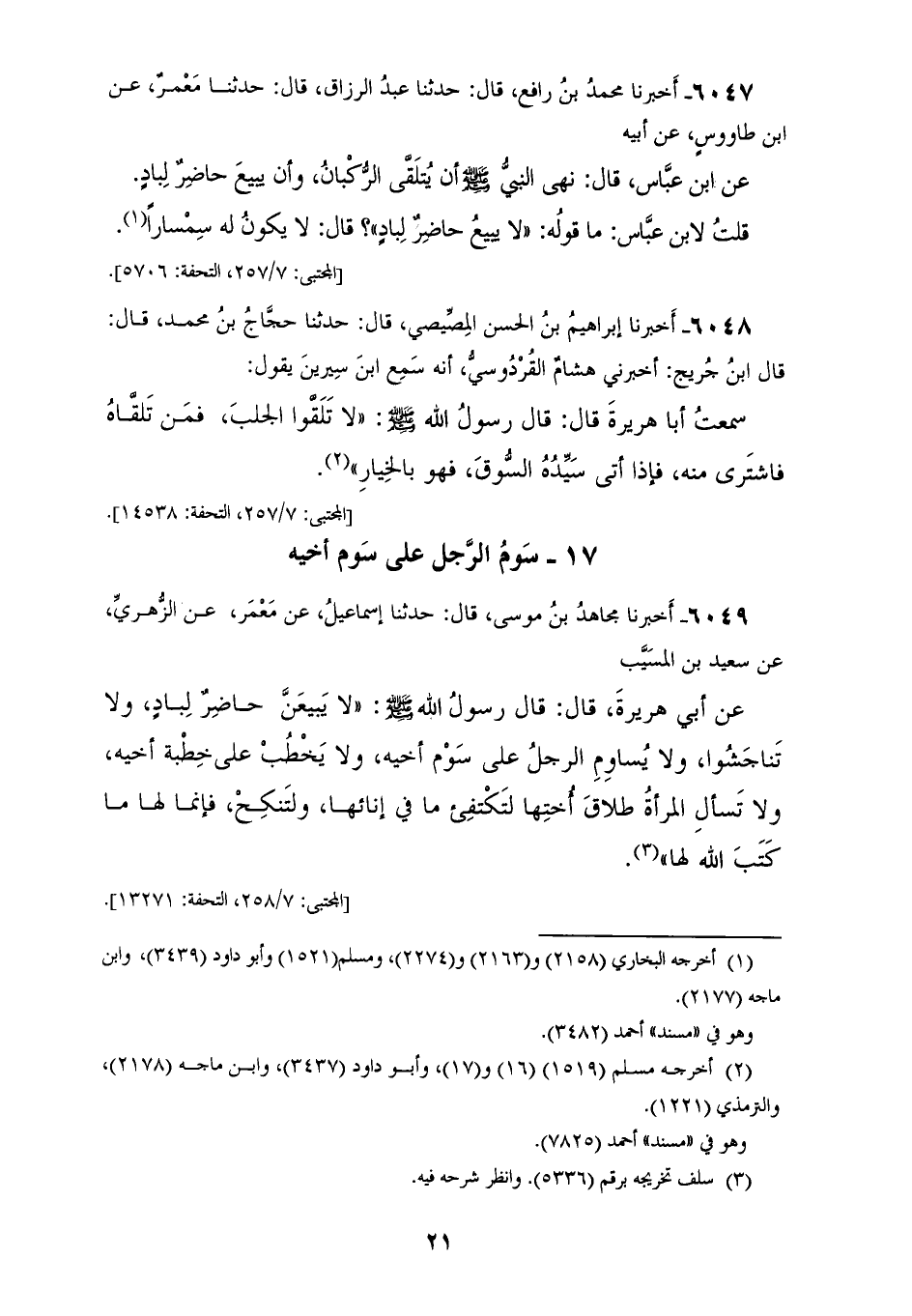 6047 - أَخْبَرَنَا مُحَمَّدُ بْنُ رَافِعٍ، قَالَ: حَدَّثَنَا عَبْدُ الرَّزَّاقِ، قَالَ: حَدَّثَنَا مَعْمَرٌ، عَنِ ابْنِ طَاوُسٍ، عَنْ أَبِيهِ، عَنِ ابْنِ عَبَّاسٍ، قَالَ: نَهَى النَّبِيُّ صَلَّى اللهُ عَلَيْهِ وَسَلَّمَ أَنْ §يُتَلَقَّى الرُّكْبَانُ، وَأَنْ يَبِيعَ حَاضِرٌ لِبَادٍ، قُلْتُ لِابْنِ عَبَّاسٍ: مَا قَوْلُهُ: لَا يَبِيعُ حَاضِرٌ لِبَادٍ؟، قَالُوا: لَا يَكُونُ لَهُ سِمْسَارًا