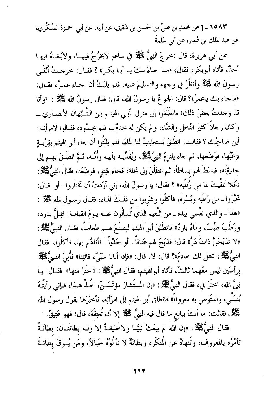 6583 - عَنْ مُحَمَّدِ بْنِ عَلِيِّ بْنِ الْحَسَنِ بْنِ شَقِيقٍ، عَنْ أَبِيهِ، عَنْ أَبِي حَمْزَةَ السُّكَّرِيِّ، عَنْ عَبْدِ الْمَلِكِ بْنِ عُمَيْرٍ، عَنْ أَبِي سَلَمَةَ، عَنْ أَبِي هُرَيْرَةَ، قَالَ: خَرَجَ النَّبِيُّ صَلَّى اللهُ عَلَيْهِ وَسَلَّمَ فِي سَاعَةٍ لَا يَخْرُجُ فِيهَا، وَلَا يَلْقَاهُ فِيهَا أَحَدٌ، فَأَتَاهُ أَبُو بَكْرٍ فَقَالَ: «مَا جَاءَ بِكَ يَا أَبَا بَكْرٍ؟»، فَقَالَ: خَرَجْتُ أَلْقَى رَسُولَ اللهِ صَلَّى اللهُ عَلَيْهِ وَسَلَّمَ وَأَنْظُرُ فِي وَجْهِهِ وَالتَّسْلِيمَ عَلَيْهِ، فَلَمْ يَلْبَثْ أَنْ جَاءَ عُمَرُ، فَقَالَ: «مَا جَاءَ بِكَ يَا عُمَرُ؟»، قَالَ: الْجُوعُ يَا رَسُولَ اللهِ، قَالَ: فَقَالَ رَسُولُ اللهِ صَلَّى اللهُ عَلَيْهِ وَسَلَّمََ: «وَأَنَا قَدْ وَجَدْتُ بَعْضَ ذَلِكَ»، فَانْطَلِقُوا إِلَى مَنْزِلِ أَبِي الْهَيْثَمِ بْنِ التَّيِّهَانِ الْأَنْصَارِيِّ، وَكَانَ رَجُلًا كَثِيرَ النَّخْلِ وَالشَّاءِ، وَلَمْ يَكُنْ لَهُ خَدَمٌ، فَلَمْ يَجِدُوهُ، فَقَالُوا لِامْرَأَتِهِ: أَيْنَ صَاحِبُكِ؟، فَقَالَتْ: انْطَلَقَ يَسْتَعْذِبْ لَنَا الْمَاءَ، فَلَمْ يَلْبَثُوا أَنْ جَاءَ أَبُو الْهَيْثَمِ بِقِرْبَةٍ يَزْعُبُهَا، فَوَضَعَهَا، ثُمَّ جَاءَ يَلْتَزِمُ النَّبِيَّ صَلَّى اللهُ عَلَيْهِ وَسَلَّمَ، وَيُفَدِّيهِ بِأَبِيهِ وَأُمِّهِ، ثُمَّ انْطَلَقَ بِهِمْ إِلَى حَدِيقَتِهِ، فَبَسَطَ لَهُمْ بِسَاطًا، ثُمَّ انْطَلَقَ إِلَى نَخْلَةٍ، فَجَاءَ بِقِنْوٍ، فَوَضَعَهُ، فَقَالَ النَّبِيُّ صَلَّى اللهُ عَلَيْهِ وَسَلَّمَ: «أَفَلَا تَنَقَّيْتَ لَنَا مِنْ رُطَبِهِ»، فَقَالَ: يَا رَسُولَ اللهِ، إِنِّي أَرَدْتُ أَنْ تَخْتَارُوا أَوْ قَالَ: تَخَيَّرُوا مِنْ رُطَبِهِ وَبُسْرِهِ، فَأَكَلُوا وَشَرِبُوا مِنْ ذَلِكَ الْمَاءِ، فَقَالَ رَسُولُ اللهِ صَلَّى اللهُ عَلَيْهِ وَسَلَّمَ: " هَذَا وَالَّذِي نَفْسِي بِيَدِهِ مِنَ النَّعِيمِ الَّذِي تُسْأَلُونَ عَنْهُ يَوْمَ الْقِيَامَةِ: ظِلٌّ بَارِدٌ، وَرُطَبٌ طَيِّبٌ، وَمَاءٌ بَارِدٌ " فَانْطَلَقَ أَبُو الْهَيْثَمِ لِيَصْنَعَ لَهُمْ طَعَامًا فَقَالَ النَّبِيُّ صَلَّى اللهُ عَلَيْهِ وَسَلَّمَ: «لَا تَذْبَحَنَّ ذَاتَ دَرٍّ» قَالَ: فَذَبَحَ لَهُمْ عَنَاقًا، أَوْ جَدْيًا، فَأَتَاهُمْ بِهَا، فَأَكَلُوا، فَقَالَ النَّبِيُّ صَلَّى اللهُ عَلَيْهِ وَسَلَّمَ: «هَلْ لَكَ خَادِمٌ؟»، قَالَ: لَا، قَالَ: «فَإِذَا أَتَانَا سَبْيٌ فَائْتِنَا»، فَأُتِيَ النَّبِيُّ صَلَّى اللهُ عَلَيْهِ وَسَلَّمَ بِرَأْسَيْنِ لَيْسَ مَعَهُمَا ثَالِثٌ، فَأَتَاهُ أَبُو الْهَيْثَمِ، فَقَالَ النَّبِيُّ صَلَّى اللهُ عَلَيْهِ وَسَلَّمَ: «اخْتَرْ مِنْهَا» فَقَالَ: يَا نَبِيَّ اللهِ اخْتَرْ لِي، فَقَالَ النَّبِيُّ صَلَّى اللهُ عَلَيْهِ وَسَلَّمَ: «إِنَّ §الْمْسُتْشَارَ مُؤْتَمَنٌ، خُذْ هَذَا، فَإِنِّي رَأَيْتُهُ يُصَلِّي، وَاسْتَوْصِ بِهِ مَعْرُوفًا»، فَانْطَلَقَ أَبُو الْهَيْثَمِ إِلَى امْرأَتِهِ، فَأَخْبَرَهَا بِقَوْلِ رَسُولِ اللهِ صَلَّى اللهُ عَلَيْهِ وَسَلَّمَ، فَقَالَتْ: مَا أَنْتَ بِبَالِغٍ مَا قَالَ فِيهِ النَّبِيّ صَلَّى اللهُ عَلَيْهِ وَسَلَّمَ إِلَّا أَنْ تُعتِقَهُ، قَالَ: فَهُوَ عَتِيقٌ، فَقَالَ النَّبِيُّ صَلَّى اللهُ عَلَيْهِ وَسَلَّمَ: " إِنَّ اللهَ لَمْ يَبْعَثْ نَبِيًّا وَلَا خَلِيفَةً إلِاَّ وَلَهُ بِطَانَتَاَنِ: بِطَانَةٌ تَأْمُرُهُ بِالْمَعْرُوفِ وَتَنْهَاهُ عَنِ الْمُنْكَرِ، وَبِطَانَةٌ لَا تَأْلُوهُ خَبَالًا، وَمَنْ يُوقَ بِطَانَةَ السُّوءِ فَقَدْ وُقِيَ "