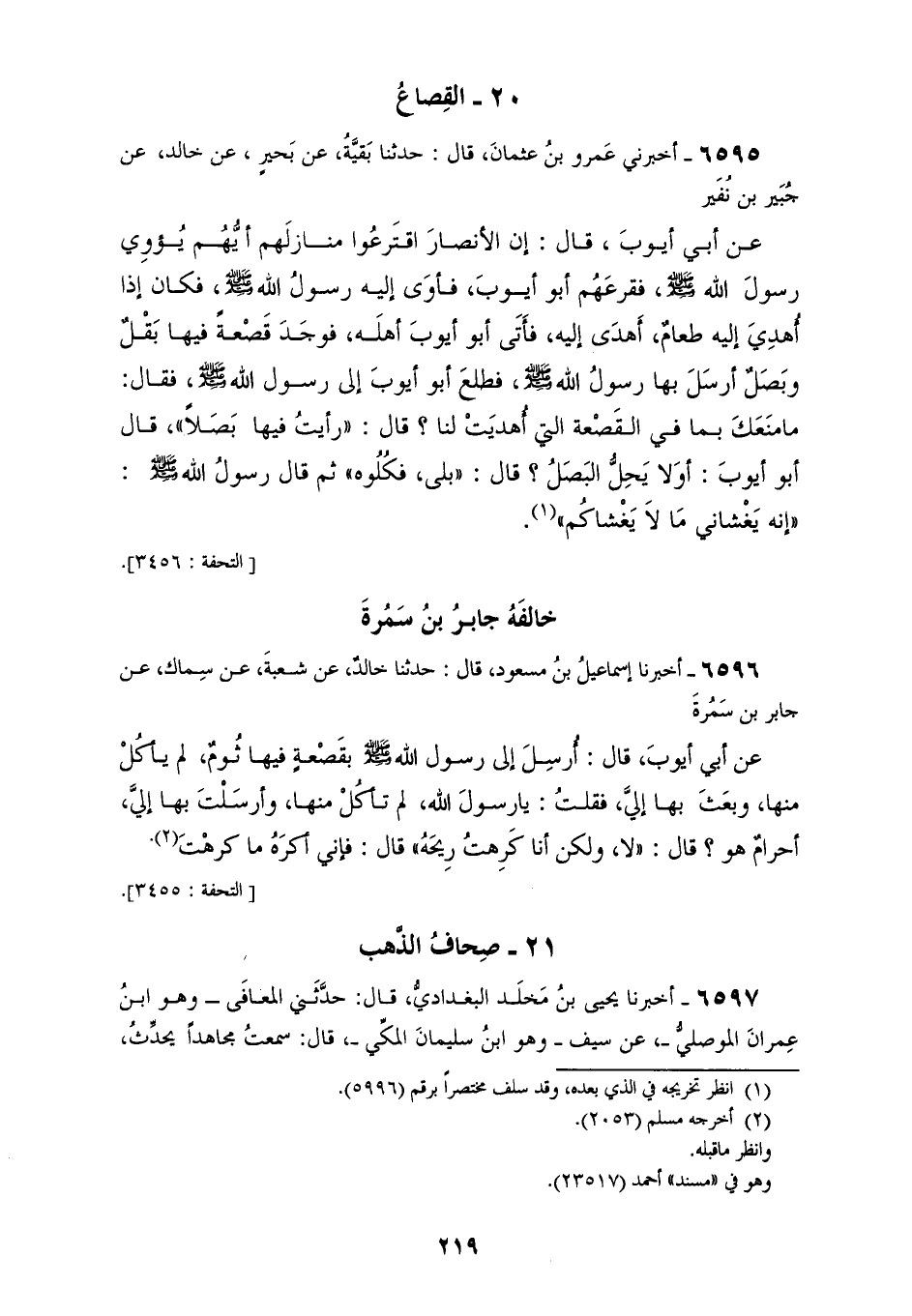 6595 - أَخْبَرَنِي عَمْرُو بْنُ عُثْمَانَ، قَالَ: حَدَّثَنَا بَقِيَّةُ، عَنْ بَحِيرٍ، عَنْ خَالِدٍ، عَنْ جُبَيْرِ بْنِ نُفَيْرٍ، عَنْ أَبِي أَيُّوبَ، قَالَ: إِنَّ الْأَنْصَارَ اقْتَرَعُوا مَنَازِلَهُمْ، أَيُّهُمْ يُؤْوِي رَسُولَ اللهِ صَلَّى اللهُ عَلَيْهِ وَسَلَّمَ، فَقَرَعَهُمْ أَبُو أَيُّوبَ، فَأَوَى إِلَيْهِ رَسُولُ اللهِ صَلَّى اللهُ عَلَيْهِ وَسَلَّمَ، فَكَانَ إِذَا أُهْدِيَ إِلَيْهِ طَعَامٌ أَهْدَى إِلَيْهِ، فَأَتَى أَبُو أَيُّوبَ أَهْلَهُ، فَوَجَدَ قَصْعَةً فِيهَا بَقْلٌ وَبَصَلٌ، أَرْسَلَ بِهَا رَسُولُ اللهِ صَلَّى اللهُ عَلَيْهِ وَسَلَّمَ، فَطَلَعَ أَبُو أَيُّوبَ إِلَى رَسُولِ اللهِ صَلَّى اللهُ عَلَيْهِ وَسَلَّمَ، فَقَالَ: مَا مَنَعَكَ بِمَا فِي الْقَصْعَةِ الَّتِي أُهْدِيَتْ لَنَا؟، قَالَ: «رَأَيْتُ فِيهَا بَصَلًا»، قَالَ أَبُو أَيُّوبَ: أَوَلَا يَحِلُّ الْبَصَلُ؟، قَالَ: بَلْ، فَكُلُوهُ "، ثُمَّ قَالَ رَسُولُ اللهِ صَلَّى اللهُ عَلَيْهِ وَسَلَّمَ: إِنَّهُ §يَغْشَانِي مَا لَا يَغْشَاكُمْ " خَالَفَهُ جَابِرُ بْنُ سَمُرَةَ