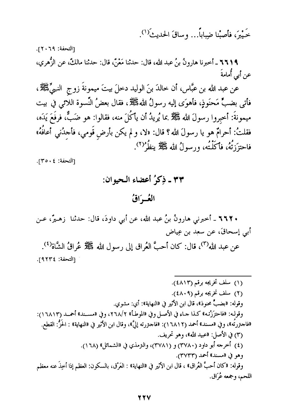 6620 - أَخْبَرَنِي هَارُونُ بْنُ عَبْدِ اللهِ، عَنْ أَبِي دَاوُدَ، قَالَ: حَدَّثَنَا زُهَيْرٌ، عَنْ أَبِي إِسْحَاقَ، عَنْ سَعْدِ بْنِ عِيَاضٍ، عَنْ عَبْدِ اللهِ، قَالَ: «كَانَ §أَحَبُّ الْعُرَاقِ إِلَى رَسُولِ اللهِ صَلَّى اللهُ عَلَيْهِ وَسَلَّمَ عُرَاقَ الشَّاةِ»