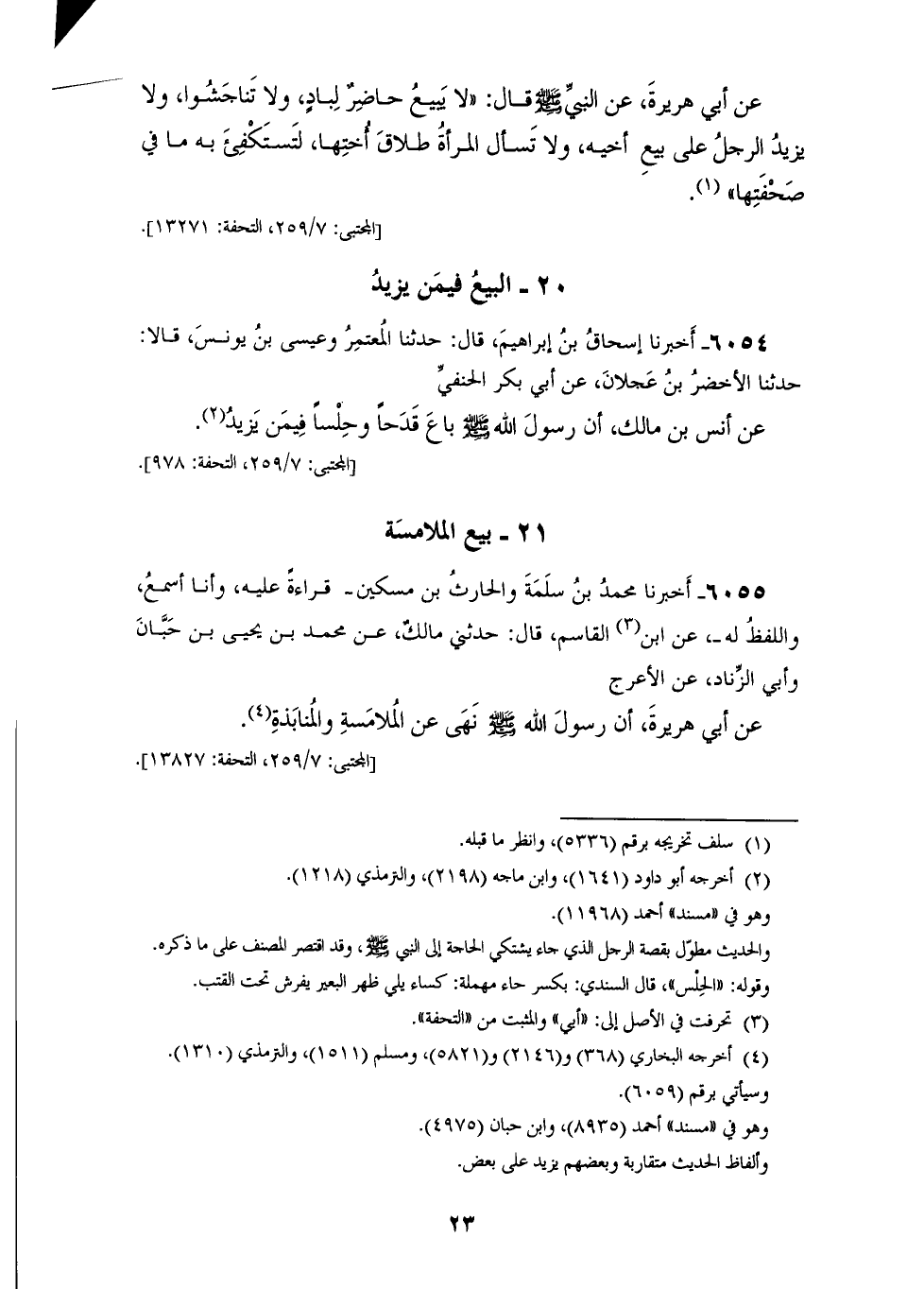 6055 - أَخْبَرَنَا مُحَمَّدُ بْنُ سَلَمَةَ، وَالْحَارِثُ بْنُ مِسْكِينٍ، قِرَاءَةً عَلَيْهِ، وَأَنَا أَسْمَعُ وَاللَّفْظُ لَهُ عَنِ ابْنِ الْقَاسِمِ، قَالَ: حَدَّثَنِي مَالِكٌ، عَنْ مُحَمَّدِ بْنِ يَحْيَى بْنِ حَبَّانَ، وَأَبِي الزِّنَادِ، عَنِ الْأَعْرَجِ، عَنْ أَبِي هُرَيْرَةَ، أَنَّ رَسُولَ اللهِ صَلَّى اللهُ عَلَيْهِ وَسَلَّمَ نَهَى §عَنِ الْمُلَامَسَةِ وَالْمُنَابَذَةِ