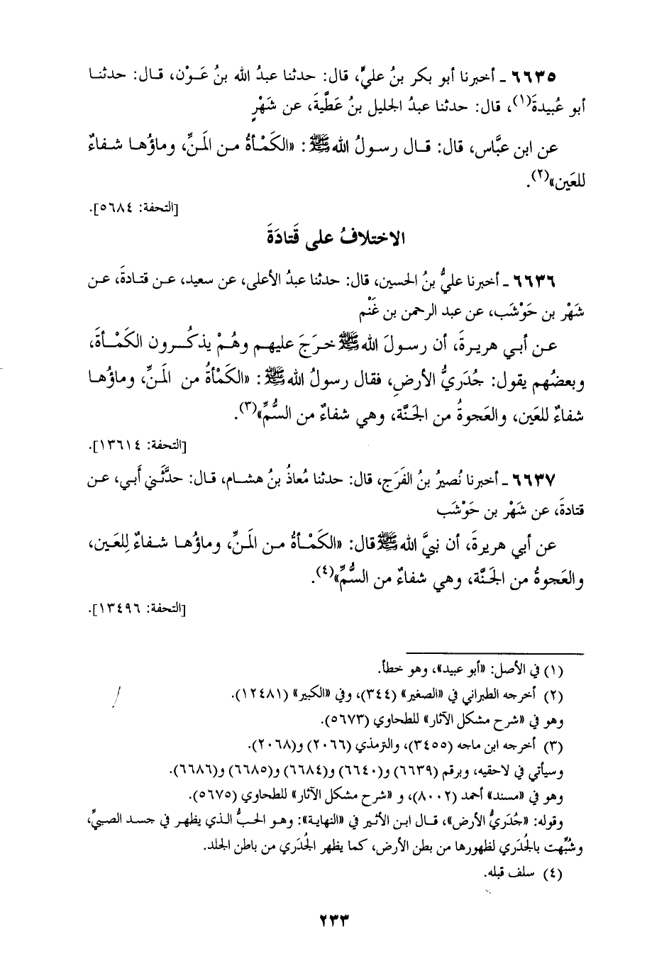 6635 - أَخْبَرَنَا أَبُو بَكْرِ بْنُ عَلِيٍّ، قَالَ: حَدَّثَنَا عَبْدُ اللهِ بْنُ عَوْنٍ، قَالَ: حَدَّثَنَا أَبُو عُبَيْدَةَ، قَالَ: حَدَّثَنَا عَبْدُ الْجَلِيلِ بْنُ عَطِيَّةَ، عَنْ شَهْرٍ، عَنِ ابْنِ عَبَّاسٍ قَالَ: قَالَ رَسُولُ اللهِ صَلَّى اللهُ عَلَيْهِ وَسَلَّمَ: «§الْكَمْأَةُ مِنَ الْمَنِّ، وَمَاؤُهَا شِفَاءٌ لِلْعَيْنِ»