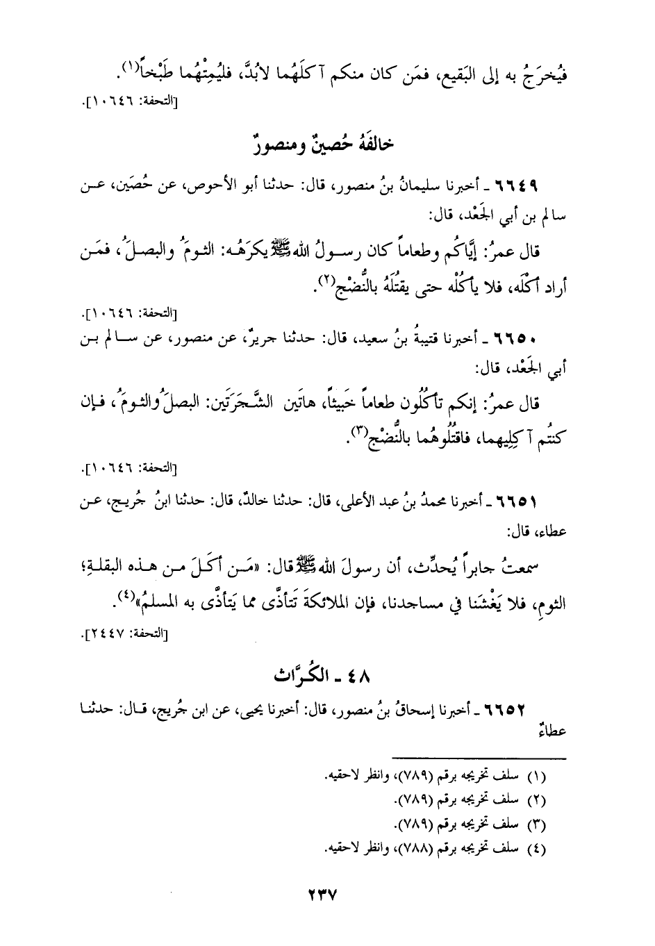 6649 - أَخْبَرَنَا سُلَيْمَانُ بْنُ مَنْصُورٍ، قَالَ: حَدَّثَنَا أَبُو الْأَحْوَصِ، عَنْ حُصَيْنٍ، عَنْ سَالِمِ بْنِ أَبِي الْجَعْدِ، قَالَ: قَالَ عُمَرُ: «§إِيَّاكُمْ وَطَعَامًا كَانَ رَسُولُ اللهِ صَلَّى اللهُ عَلَيْهِ وَسَلَّمَ يَكْرَهُهُ، الثُّومَ وَالْبَصَلَ، فَمَنْ أَرَادَ أَكْلَهُ فَلَا يَأْكُلْهُ حَتَّى يَقْتُلَهُ بِالنُّضْجِ»