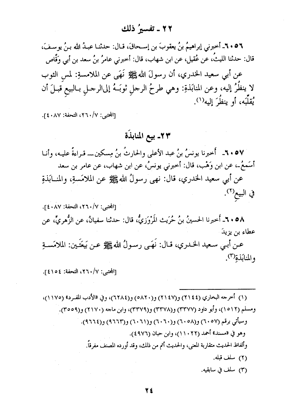 6056 - أَخْبَرَنِي إِبْرَاهِيمُ بْنُ يَعْقُوبَ بْنِ إِسْحَاقَ، قَالَ: حَدَّثَنَا عَبْدُ اللهِ بْنُ يُوسُفَ، قَالَ: حَدَّثَنَا اللَّيْثُ، عَنْ عَقِيلٍ، عَنِ ابْنِ شِهَابٍ، قَالَ: أَخْبَرَنِي عَامِرُ بْنُ سَعْدِ بْنِ أَبِي وَقَّاصٍ، عَنْ أَبِي سَعِيدٍ الْخُدْرِيِّ، أَنَّ رَسُولَ اللهِ صَلَّى اللهُ عَلَيْهِ وَسَلَّمَ نَهَى §عَنِ الْمُلَامَسَةِ، لَمْسِ الثَّوْبِ لَا يَنْظُرُ إِلَيْهِ، وَعَنِ الْمُنَابَذَةِ، وَهِيَ طَرْحُ الرَّجُلِ ثَوْبَهُ إِلَى الرَّجُلِ بِالْبَيْعِ قَبْلَ أَنْ يُقَلِّبَهُ أَوْ يَنْظُرَ إِلَيْهِ