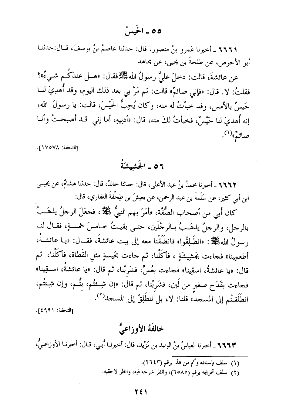 6662 - أَخْبَرَنَا مُحَمَّدُ بْنُ عَبْدِ الْأَعْلَى، قَالَ: حَدَّثَنَا خَالِدٌ، قَالَ: حَدَّثَنَا هِشَامٌ، عَنْ يَحْيَى بْنِ أَبِي كَثِيرٍ، عَنْ أَبِي سَلَمَةَ بْنِ عَبْدِ الرَّحْمَنِ، عَنْ يَعِيشَ بْنِ طِخْفَةَ الْغِفَارِيِّ، قَالَ: كَانَ أَبِي مِنْ أَصْحَابِ الصُّفَّةِ، فَأَمَرَ بِهِمُ النَّبِيُّ صَلَّى اللهُ عَلَيْهِ وَسَلَّمَ، فَجَعَلَ الرَّجُلُ يَذْهَبُ بِالرَّجُلِ، وَالرَّجُلُ يَذْهَبُ بِالرَّجُلَيْنِ، حَتَّى بَقِيتُ خَامِسَ خَمْسَةٍ، فَقَالَ لَنَا رَسُولُ اللهِ صَلَّى اللهُ عَلَيْهِ وَسَلَّمَ: «انْطَلِقُوا»، فَانْطَلَقْنَا مَعَهُ إِلَى بَيْتِ عَائِشَةَ، فَقَالَ: يَا عَائِشَةُ، أَطْعِمِينَا، فَجَاءَتْ بِجَشِيشَةٍ، فَأَكَلْنَا، ثُمَّ جَاءَتْ بِحَيْسَةٍ مِثْلِ الْقَطَاةِ، فَأَكَلْنَا، ثُمَّ قَالَ: يَا عَائِشَةُ، اسْقِينَا، فَجَاءَتْ بِعُسٍّ، فَشَرِبْنَا، ثُمَّ قَالَ: يَا عَائِشَةُ، اسْقِينَا، فَجَاءَتْ بِقَدَحٍ صَغِيرٍ مِنْ لَبَنٍ، فَشَرِبْنَا، ثُمَّ قَالَ: «§إِنْ شِئْتُمْ بِتُّمْ، وَإِنْ شِئْتُمُ انْطَلَقْتُمْ إِلَى الْمَسْجِدِ» قُلْنَا: لَا، بَلْ نَنْطَلِقُ إِلَى الْمَسْجِدِ خَالَفَهُ الْأَوْزَاعِيُّ
