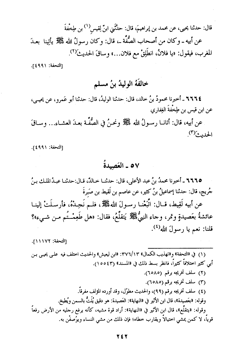 6665 - أَخْبَرَنَا مُحَمَّدُ بْنُ عَبْدِ الْأَعْلَى، قَالَ: حَدَّثَنَا خَالِدٌ، قَالَ: حَدَّثَنَا عَبْدُ الْمَلِكِ بْنُ جُرَيْجٍ، قَالَ: حَدَّثَنَا إِسْمَاعِيلُ بْنُ كَثِيرٍ، عَنْ عَاصِمِ بْنِ لَقِيطِ بْنِ صَبْرَةَ، عَنْ أَبِيهِ لَقِيطٍ، قَالَ: اتَّبَعْنَا رَسُولَ اللهِ صَلَّى اللهُ عَلَيْهِ وَسَلَّمَ، فَلَمْ نَجِدْهُ، فَأَرْسَلَتْ إِلَيْنَا عَائِشَةُ بِعَصِيدَةٍ وَتَمْرٍ، وَجَاءَ النَّبِيُّ صَلَّى اللهُ عَلَيْهِ وَسَلَّمَ يَتَقَلَّعُ، فَقَالَ: «§هَلْ طَعِمْتُمْ مِنْ شَيْءٍ؟»، قُلْنَا: نَعَمْ يَا رَسُولَ اللهِ "