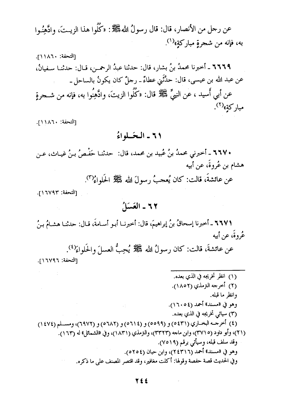 6671 - أَخْبَرَنَا إِسْحَاقُ بْنُ إِبْرَاهِيمَ، قَالَ: أَخْبَرَنَا أَبُو أُسَامَةَ، قَالَ: حَدَّثَنَا هِشَامُ بْنُ عُرْوَةَ، عَنْ أَبِيهِ، عَنْ عَائِشَةَ، قَالَتْ: «كَانَ §رَسُولُ اللهِ صَلَّى اللهُ عَلَيْهِ وَسَلَّمَ، يُحِبُّ الْعَسَلَ، وَالْحَلْوَاءَ»