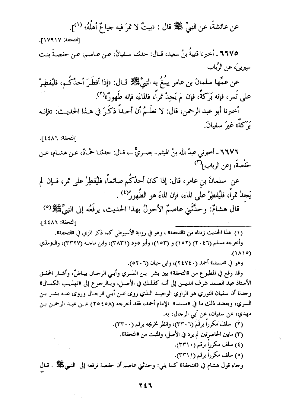 6675 - أَخْبَرَنَا قُتَيْبَةُ بْنُ سَعِيدٍ، قَالَ: حَدَّثَنَا سُفْيَانُ، عَنْ عَاصِمٍ، عَنْ حَفْصَةَ بِنْتِ سِيرِينَ، عَنِ الرَّبَابِ، عَنْ عَمِّهَا سَلْمَانَ بْنِ عَامِرٍ يَبْلُغُ بِهِ النَّبِيَّ صَلَّى اللهُ عَلَيْهِ وَسَلَّمَ، قَالَ: «§إِذَا أَفْطَرَ أَحَدُكُمْ فَلْيُفْطِرْ عَلَى تَمْرٍ، فَإِنَّهُ بَرَكَةٌ، فَإِنْ لَمْ يَجِدْ تَمْرًا فَالْمَاءُ، فَإِنَّهُ طَهُوَرٌ» أَخْبَرَنَا أَبُو عَبْدِ الرَّحْمَنِ قَالَ: لَا نَعْلَمُ أَنَّ أَحَدًا ذَكَرَ فِي هَذَا الْحَدِيثِ «فَإِنَّهُ بَرَكَةٌ» غَيْرَ سُفْيَانَ