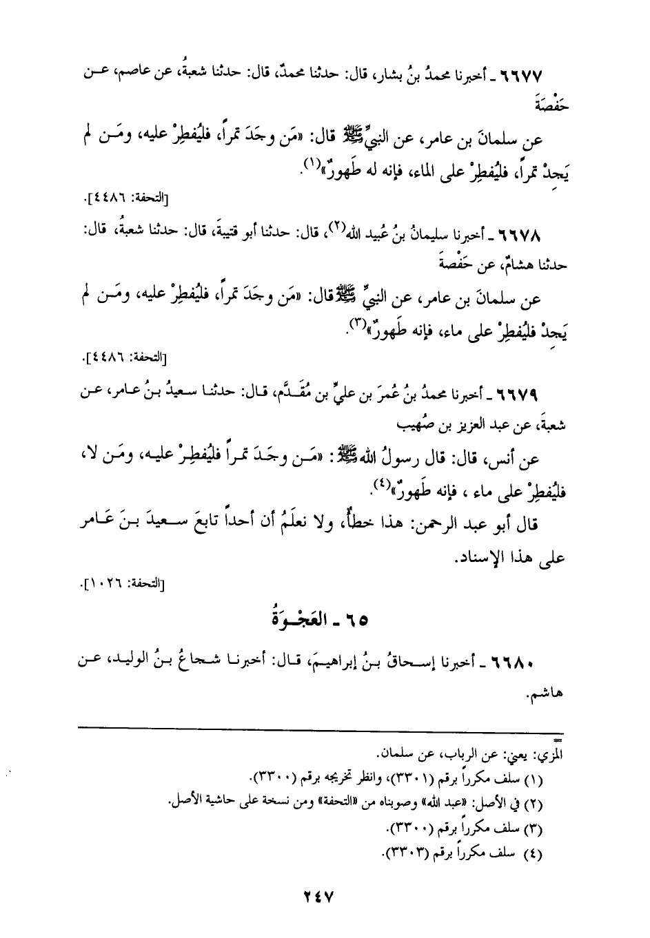 6678 - أَخْبَرَنَا سُلَيْمَانُ بْنُ عُبَيْدِ اللهِ، قَالَ: حَدَّثَنَا أَبُو قُتَيْبَةَ، قَالَ: حَدَّثَنَا شُعْبَةُ، قَالَ: حَدَّثَنَا هِشَامٌ، عَنْ حَفْصَةَ، عَنْ سَلْمَانَ بْنِ عَامِرٍ، عَنِ النَّبِيِّ صَلَّى اللهُ عَلَيْهِ وَسَلَّمَ، قَالَ: «§مَنْ وَجَدَ تَمْرًا فَلْيُفْطِرْ عَلَيْهِ، وَمَنْ لَمْ يَجِدْ فَلْيُفْطِرْ عَلَى مَاءٍ، فَإِنَّهُ طَهُوَرٌ»