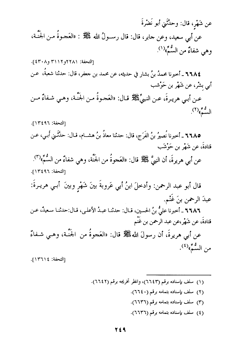 6685 - أَخْبَرَنَا نُصَيْرُ بْنُ الْفَرَجِ، قَالَ: حَدَّثَنَا مُعَاذُ بْنُ هِشَامٍ، قَالَ: حَدَّثَنِي أَبِي، عَنْ قَتَادَةَ، عَنْ شَهْرِ بْنِ حَوْشَبٍ، عَنْ أَبِي هُرَيْرَةَ، أَنَّ النَّبِيَّ صَلَّى اللهُ عَلَيْهِ وَسَلَّمَ قَالَ: «§الْعَجْوَةُ مِنَ الْجَنَّةِ، وَهِيَ شِفَاءٌ مِنَ السُّمِّ» قَالَ أَبُو عَبْدِ الرَّحْمَنِ: وَأَدْخَلَ ابْنُ أَبِي عَرُوبَةَ بَيْنَ شَهْرٍ وَبَيْنَ أَبِي هُرَيْرَةَ عَبْدَ الرَّحْمَنِ بْنَ غَنْمٍ