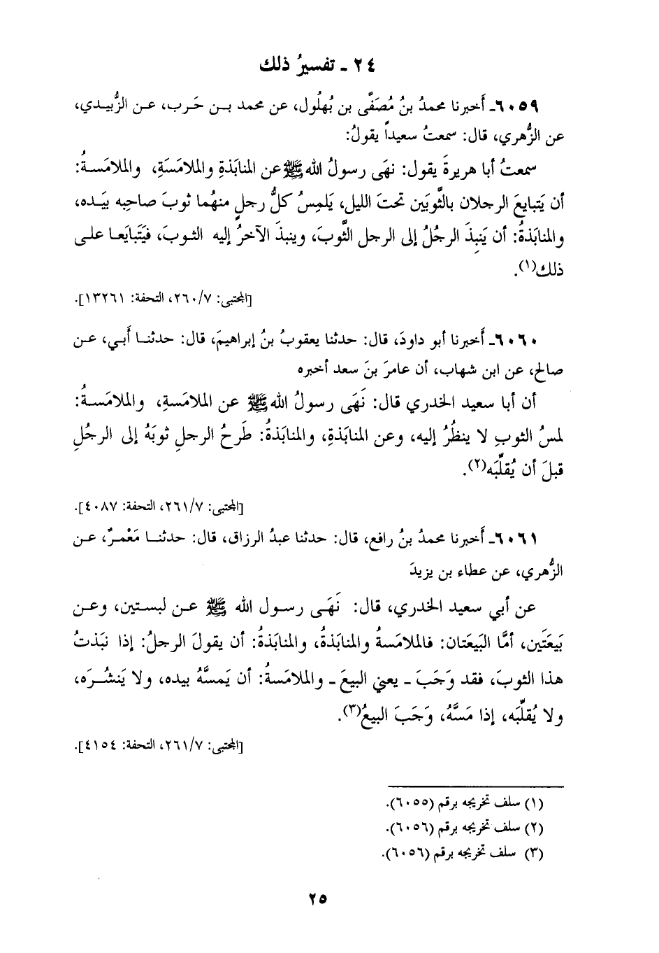 6059 - أَخْبَرَنَا مُحَمَّدُ بْنُ مُصَفَّى بْنِ بُهْلُولٍ، عَنْ مُحَمَّدِ بْنِ حَرْبٍ، عَنِ الزُّبَيْدِيِّ، عَنِ الزُّهْرِيِّ، قَالَ: سَمِعْتُ سَعِيدًا، يَقُولُ: سَمِعْتُ أَبَا هُرَيْرَةَ، يَقُولُ: نَهَى رَسُولُ اللهِ صَلَّى اللهُ عَلَيْهِ وَسَلَّمَ §عَنِ الْمُنَابَذَةِ وَالْمُلَامَسَةِ، وَالْمُلَامَسَةُ: أَنْ يَتَبَايَعَ الرَّجُلَانِ بِالثَّوْبَيْنِ تَحْتَ اللَّيْلِ، يَلْمِسُ كُلُّ رَجُلٍ مِنْهُمَا ثَوْبَ صَاحِبِهِ بِيَدِهِ، وَالْمُنَابَذَةُ أَنْ يَنْبِذَ الرَّجُلُ إِلَى الرَّجُلِ الثَّوْبَ، وَيَنْبِذَ الْآخَرُ إِلَيْهِ الثَّوْبَ فَيَتَبَايَعَا عَلَى ذَلِكَ