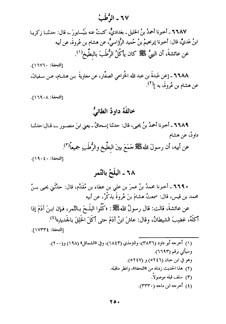 6687 - أَخْبَرَنَا أَحْمَدُ بْنُ الْخَلِيلِ بَغْدَادِيٌّ، كَتَبْتُ عَنْهُ بِنَيْسَابُورَ، قَالَ: حَدَّثَنَا زَكَرِيَّا بْنُ عَدِيٍّ، قَالَ: أَخْبَرَنَا إِبْرَاهِيمُ بْنُ حُمَيْدٍ الرُّؤَاسِيُّ، عَنْ هِشَامِ بْنِ عُرْوَةَ، عَنْ أَبِيهِ، عَنْ عَائِشَةَ، أَنَّ النَّبِيَّ صَلَّى اللهُ عَلَيْهِ وَسَلَّمَ: «كَانَ §يَأْكُلُ الرُّطَبَ بِالْبِطِّيخِ»