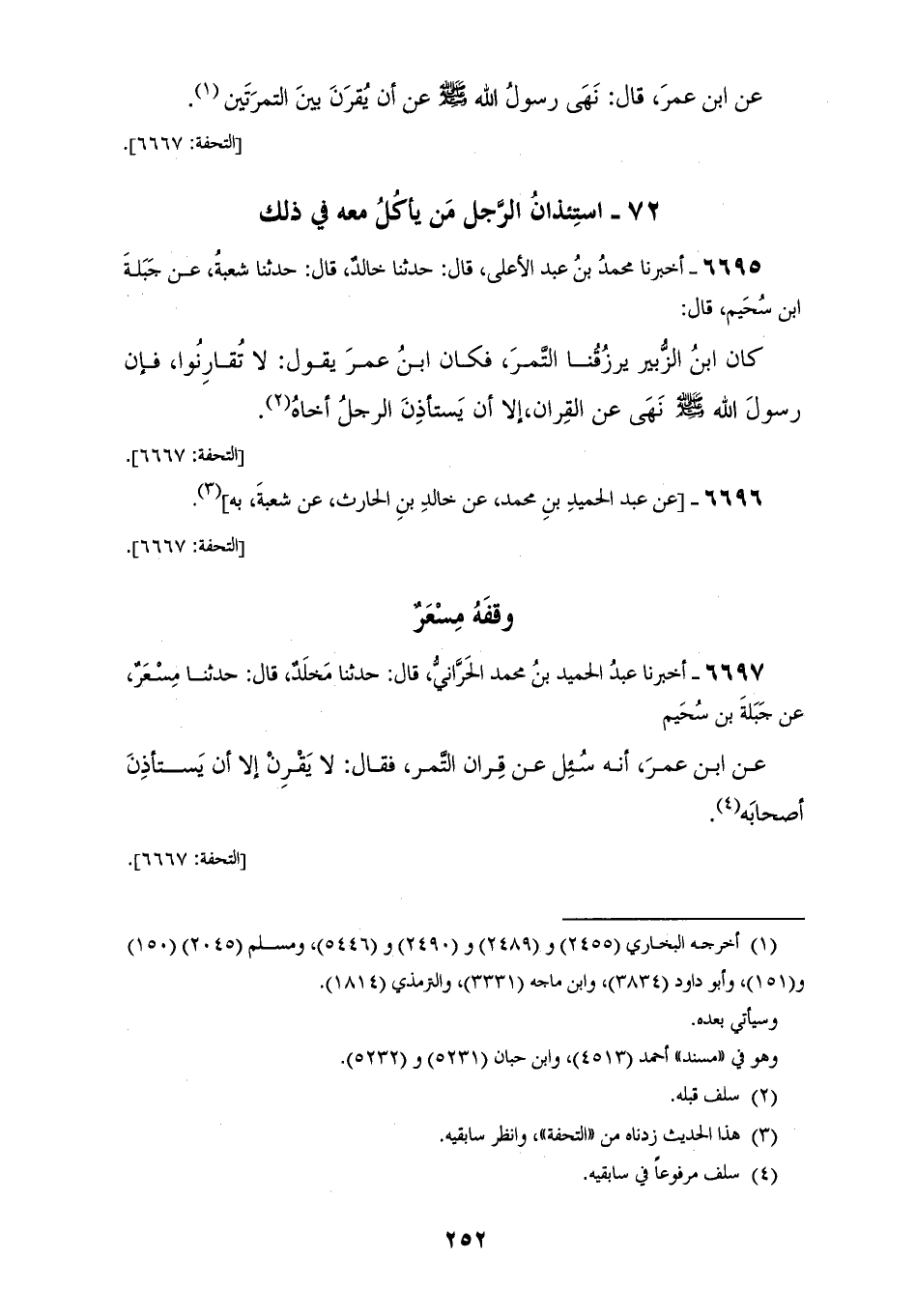 6697 - أَخْبَرَنَا عَبْدُ الْحَمِيدِ بْنُ مُحَمَّدٍ الْحَرَّانِيُّ، قَالَ: حَدَّثَنَا مَخْلَدٌ، قَالَ: حَدَّثَنَا مِسْعَرٌ، عَنْ جَبَلَةَ بْنِ سُحَيْمٍ، عَنِ ابْنِ عُمَرَ، أَنَّهُ سُئِلَ عَنْ قِرَانِ التَّمْرِ، فَقَالَ: «§لَا يَقْرِنُ، إِلَّا أَنْ يَسْتَأْذِنَ أَصْحَابَهُ»