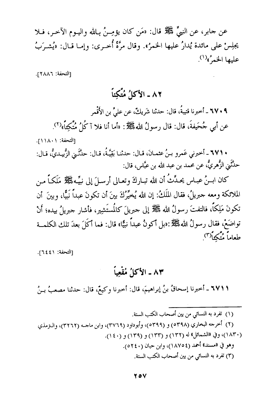 6709 - أَخْبَرَنَا قُتَيْبَةُ، قَالَ: حَدَّثَنَا شَرِيكٌ، عَنْ عَلِيِّ بْنِ الْأَقْمَرِ، عَنْ أَبِي جُحَيْفَةَ قَالَ: قَالَ رَسُولُ اللهِ صَلَّى اللهُ عَلَيْهِ وَسَلَّمَ: «§أَمَّا أَنَا، فَلَا آكُلُ مُتَّكِئًا»