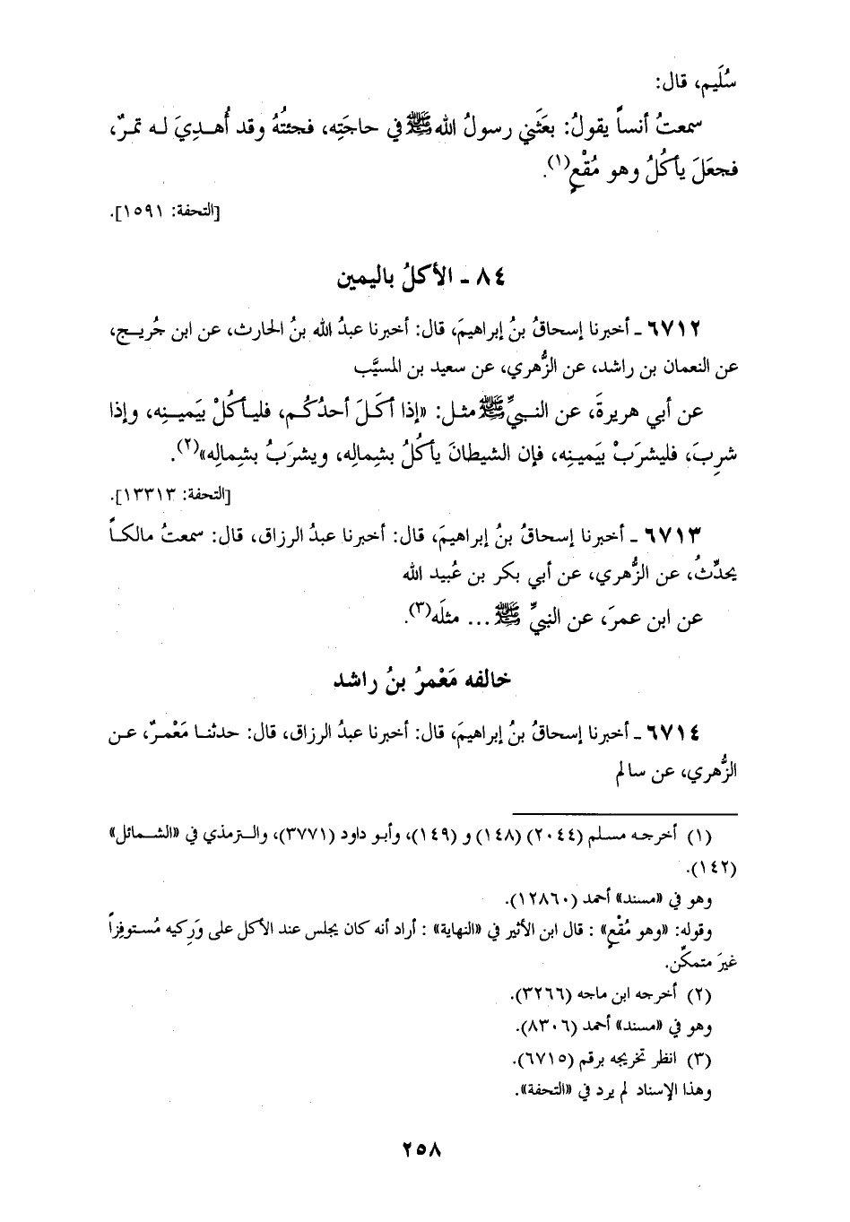 6712 - أَخْبَرَنَا إِسْحَاقُ بْنُ إِبْرَاهِيمَ، قَالَ: أَخْبَرَنَا عَبْدُ اللهِ بْنُ الْحَارِثِ، عَنِ ابْنِ جُرَيْجٍ، عَنِ النُّعْمَانِ بْنِ رَاشِدٍ، عَنِ الزُّهْرِيِّ، عَنْ سَعِيدِ بْنِ الْمُسَيِّبِ، عَنْ أَبِي هُرَيْرَةَ، عَنِ النَّبِيِّ صَلَّى اللهُ عَلَيْهِ وَسَلَّمَ، مَثَلُ: «§إِذَا أَكَلَ أَحَدُكُمْ فَلْيَأْكُلْ بِيَمِينِهِ، وَإِذَا شَرِبَ فَلْيَشْرَبْ بِيَمِينِهِ، فَإِنَّ الشَّيْطَانَ يَأْكُلُ بِشِمَالِهِ، وَيُشْرَبُ بِشِمَالِهِ»