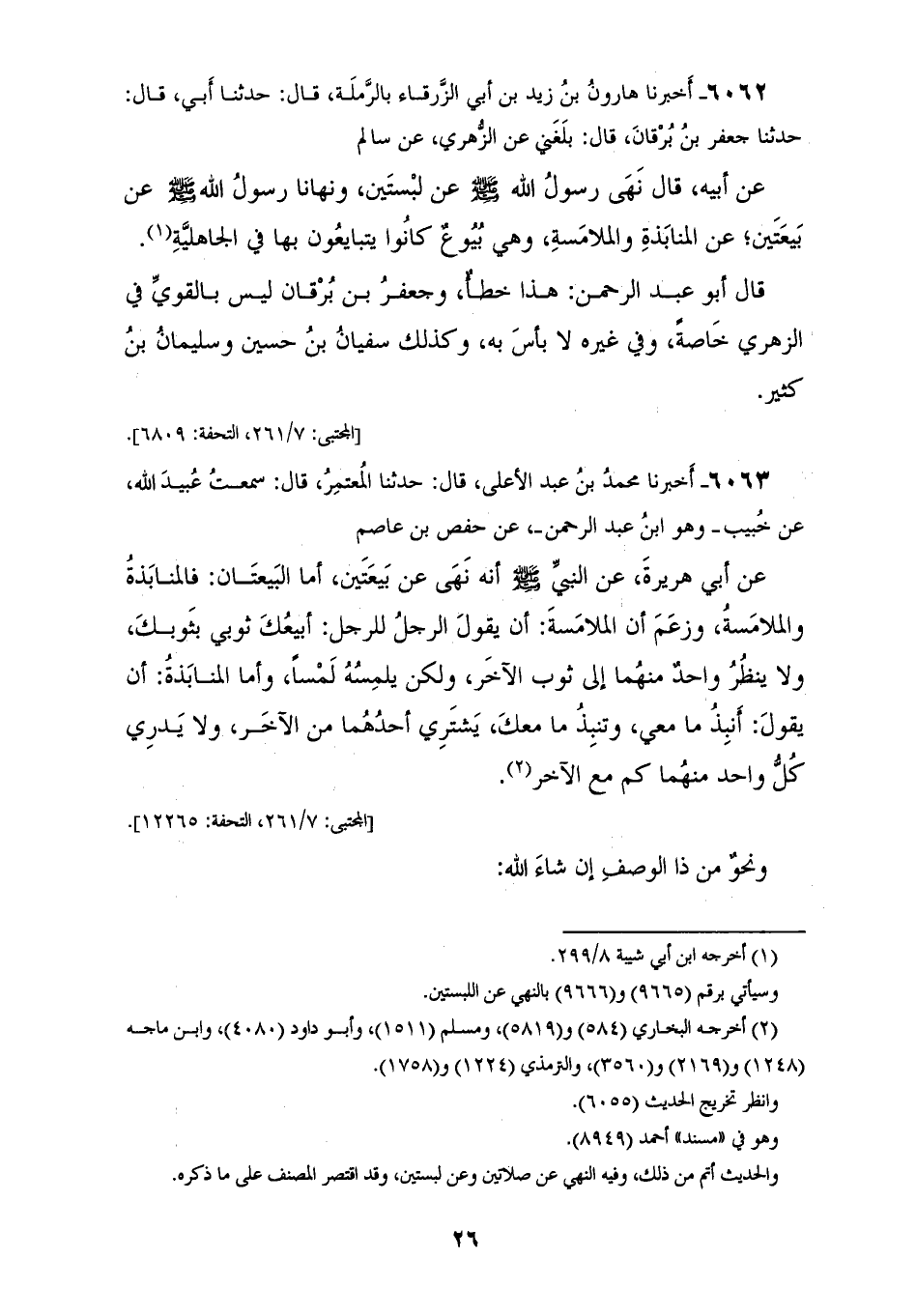 6062 - أَخْبَرَنَا هَارُونُ بْنُ زَيْدِ بْنِ أَبِي الزَّرْقَاءِ، بِالرَّمْلَةِ، قَالَ: حَدَّثَنَا أَبِي، قَالَ: حَدَّثَنَا جَعْفَرُ بْنُ بُرْقَانَ، قَالَ: بَلَغَنِي عَنِ الزُّهْرِيِّ، عَنْ سَالِمٍ، عَنْ أَبِيهِ، قَالَ: نَهَى رَسُولُ اللهِ صَلَّى اللهُ عَلَيْهِ وَسَلَّمَ §عَنْ لِبْسَتَيْنِ، وَنَهَانَا رَسُولُ اللهِ صَلَّى اللهُ عَلَيْهِ وَسَلَّمَ عَنْ بَيْعَتَيْنِ، عَنِ الْمُنَابَذَةِ وَالْمُلَامَسَةِ، وَهِيَ بَيُوعٌ كَانُوا يَتَبَايَعُونَ بِهَا فِي الْجَاهِلِيَّةِ، قَالَ أَبُو عَبْدِ الرَّحْمَنِ: هَذَا خَطَأٌ، وَجَعْفَرُ بْنُ بُرْقَانَ لَيْسَ بِالْقَوِيِّ فِي الزُّهْرِيِّ خَاصَّةً، وَفِي غَيْرِهِ لَا بَأْسَ بِهِ، وَكَذَلِكَ سُفْيَانُ بْنُ حُسَيْنٍ، وَسُلَيْمَانُ بْنُ كَثِيرٍ