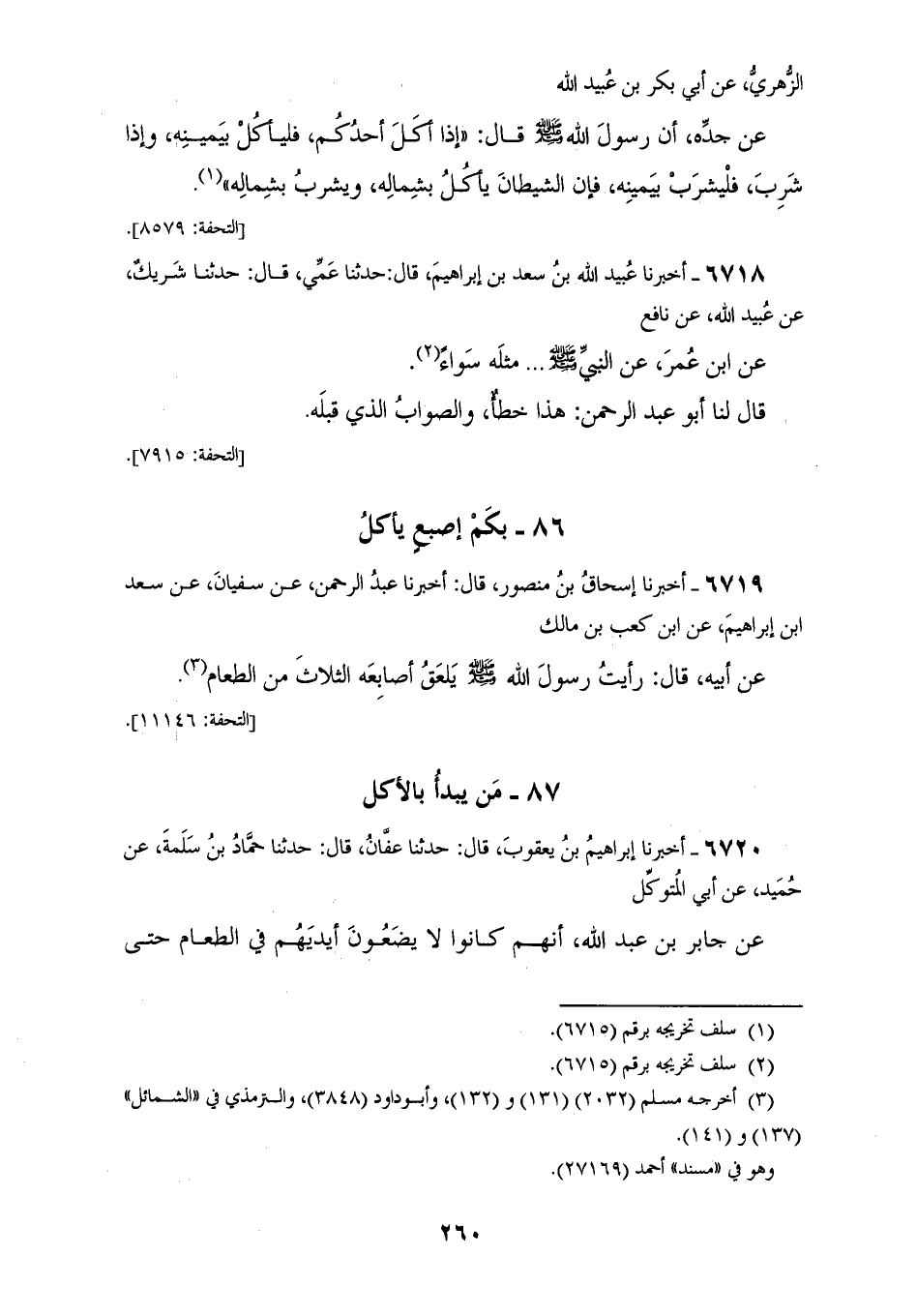 6719 - أَخْبَرَنَا إِسْحَاقُ بْنُ مَنْصُورٍ، قَالَ: أَخْبَرَنَا عَبْدُ الرَّحْمَنِ، عَنْ سُفْيَانَ، عَنْ سَعْدِ بْنِ إِبْرَاهِيمَ، عَنِ ابْنِ كَعْبِ بْنِ مَالِكٍ، عَنْ أَبِيهِ، قَالَ: «§رَأَيْتُ رَسُولَ اللهِ صَلَّى اللهُ عَلَيْهِ وَسَلَّمَ يَلْعَقُ أَصَابِعَهُ الثَّلَاثَ مِنَ الطَّعَامِ»