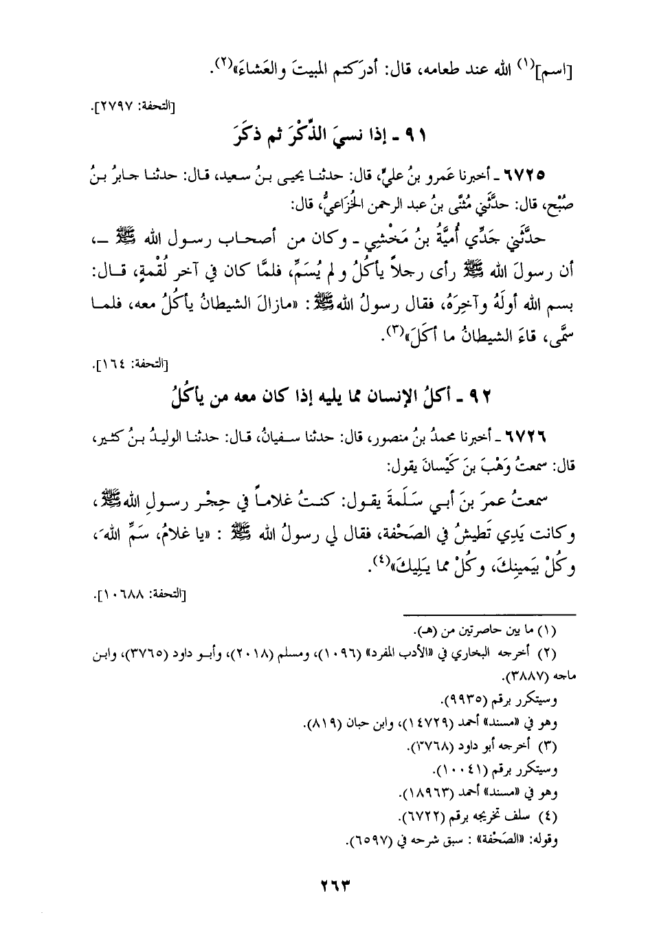 6726 - أَخْبَرَنَا مُحَمَّدُ بْنُ مَنْصُورٍ، قَالَ: حَدَّثَنَا سُفْيَانُ، قَالَ: حَدَّثَنَا الْوَلِيدُ بْنُ كَثِيرٍ، قَالَ: سَمِعْتُ وَهْبَ بْنَ كَيْسَانَ، يَقُولُ: سَمِعْتُ عُمَرَ بْنَ أَبِي سَلَمَةَ يَقُولُ: كُنْتُ غُلَامًا فِي حِجْرِ رَسُولِ اللهِ صَلَّى اللهُ عَلَيْهِ وَسَلَّمَ، وَكَانَتْ يَدِي تَطِيشُ فِي الصَّحْفَةِ، فَقَالَ لِي رَسُولُ اللهِ صَلَّى اللهُ عَلَيْهِ وَسَلَّمَ: «§يَا غُلَامُ، سَمِّ اللهَ، وَكُلْ بِيَمِينِكَ، وَكُلْ مِمَّا يَلِيكَ» خَالَفَهُ مَالِكُ بْنُ أَنَسٍ