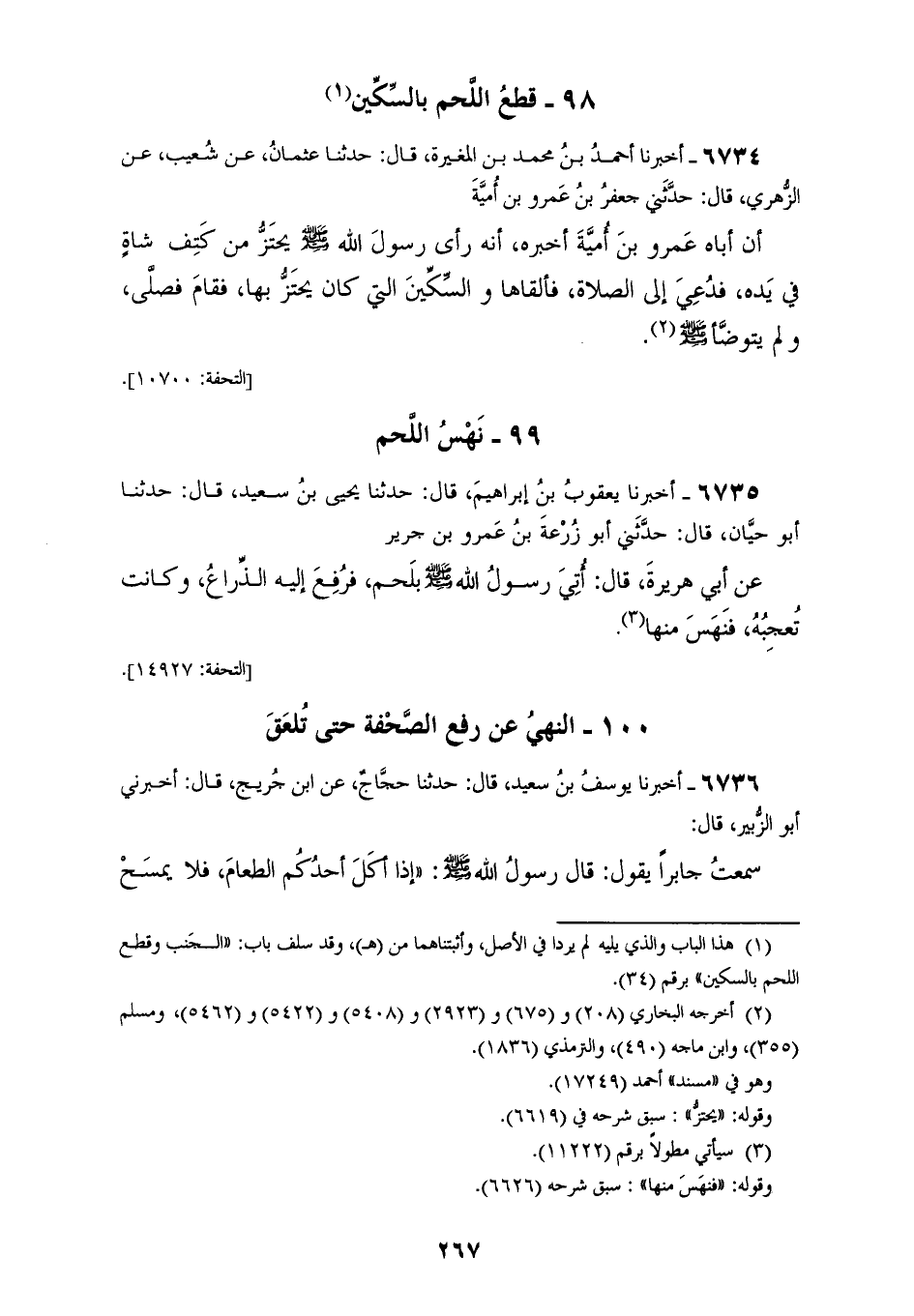 6734 - أَخْبَرَنَا أَحْمَدُ بْنُ مُحَمَّدِ بْنِ الْمُغِيرَةِ، قَالَ: حَدَّثَنَا عُثْمَانُ، عَنْ شُعَيْبٍ، عَنِ الزُّهْرِيِّ، قَالَ: حَدَّثَنِي جَعْفَرُ بْنُ عَمْرِو بْنِ أُمَيَّةَ، أَنَّ أَبَاهُ عَمْرَو بْنَ أُمَيَّةَ أَخْبَرَهُ، أَنَّهُ رَأَى رَسُولَ اللهِ صَلَّى اللهُ عَلَيْهِ وَسَلَّمَ §يَحْتَزُّ مِنْ كَتِفِ شَاةٍ فِي يَدِهِ، فَدُعِيَ إِلَى الصَّلَاةِ، فَأَلْقَاهَا وَالسِّكِّينَ الَّتِي كَانَ يَحْتَزُّ بِهَا، فَقَامَ فَصَلَّى، وَلَمْ يَتَوَضَّأْ صَلَّى اللهُ عَلَيْهِ وَسَلَّمَ