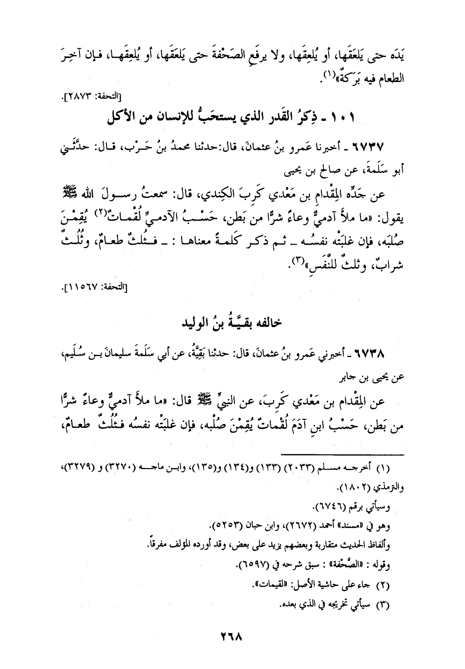 6738 - أَخْبَرَنِي عَمْرُو بْنُ عُثْمَانَ، قَالَ: حَدَّثَنَا بَقِيَّةُ، عَنْ أَبِي سَلَمَةَ سُلَيْمَانَ بْنِ سُلَيْمٍ، عَنْ يَحْيَى بْنِ جَابِرٍ، عَنِ الْمِقْدَامِ بْنِ مَعْدِي كَرِبَ، عَنِ النَّبِيِّ صَلَّى اللهُ عَلَيْهِ وَسَلَّمَ قَالَ: «§مَا مَلَأَ آدَمِيٌّ وِعَاءً شَرًّا مِنْ بَطْنٍ، حَسْبُ ابْنِ آدَمَ لُقْمَاتٌ يُقِمْنَ صُلْبَهُ، فَإِنْ غَلَبَتْهُ نَفْسُهُ فَثُلُثٌ طَعَامٌ، وَثُلُثٌ شَرَابٌ، وَثُلُثٌ لِلنَّفَسِ»