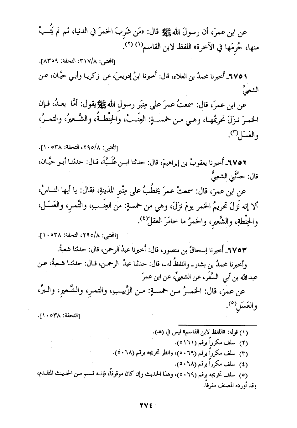 6751 - أَخْبَرَنَا مُحَمَّدُ بْنُ الْعَلَاءِ، قَالَ: أَخْبَرَنَا ابْنُ إِدْرِيسَ، عَنْ زَكَرِيَّا، وَأَبِي حَيَّانَ، عَنِ الشَّعْبِيِّ، عَنِ ابْنِ عُمَرَ، قَالَ: سَمِعْتُ عُمَرَ، عَلَى مِنْبَرِ رَسُولِ اللهِ صَلَّى اللهُ عَلَيْهِ وَسَلَّمَ يَقُولُ: أَمَّا بَعْدُ، فَإِنَّ الْخَمْرَ نَزَلَ تَحْرِيمُهَا، وَهِيَ مِنْ خَمْسَةٍ: «§الْعِنَبِ، وَالْحِنْطَةِ، وَالشَّعِيرِ، وَالتَّمْرِ، وَالْعَسَلِ»