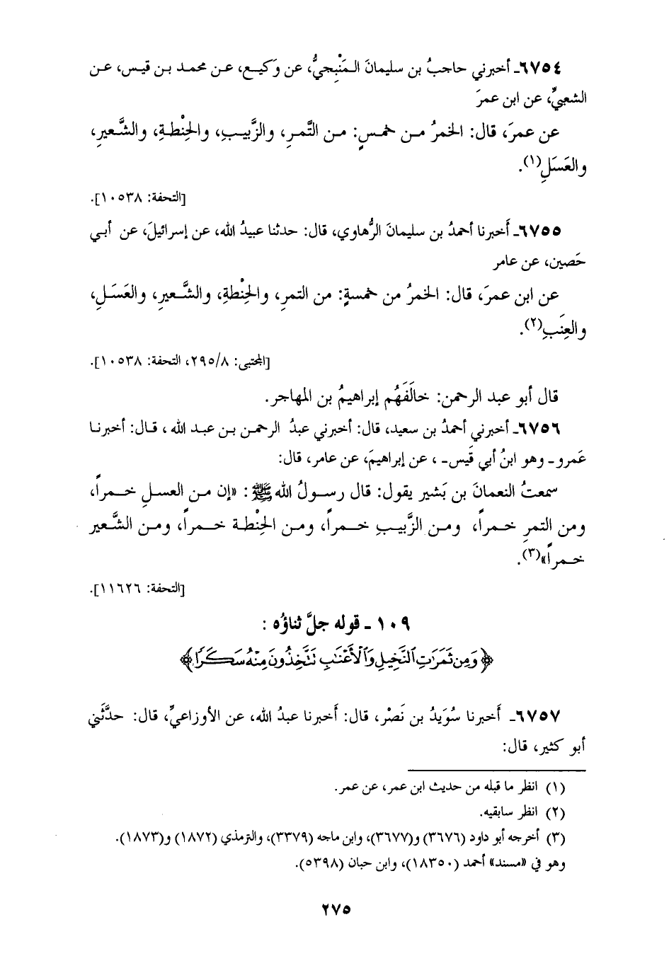 6755 - أَخْبَرَنَا أَحْمَدُ بْنُ سُلَيْمَانَ الرُّهَاوِيُّ، قَالَ: حَدَّثَنَا عُبَيْدُ اللهِ، عَنْ إِسْرَائِيلَ، عَنْ أَبِي حَصِينٍ، عَنْ عَامِرٍ، عَنِ ابْنِ عُمَرَ قَالَ: الْخَمْرُ مِنْ خَمْسَةٍ: «§مِنَ التَّمْرِ، وَالْحِنْطَةِ، وَالشَّعِيرِ، وَالْعَسَلِ، وَالْعِنَبِ» قَالَ أَبُو عَبْدِ الرَّحْمَنِ: خَالَفَهُمْ إِبْرَاهِيمُ بْنُ الْمُهَاجِرِ