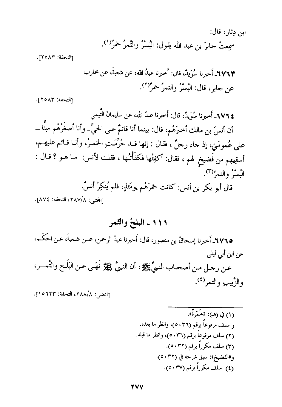 6763 - أَخْبَرَنَا سُوَيْدٌ، قَالَ: أَخْبَرَنَا عَبْدُ اللهِ، عَنْ شُعْبَةَ، عَنْ مُحَارِبٍ، عَنْ جَابِرٍ، قَالَ: «§الْبُسْرُ وَالتَّمْرُ خَمْرٌ»