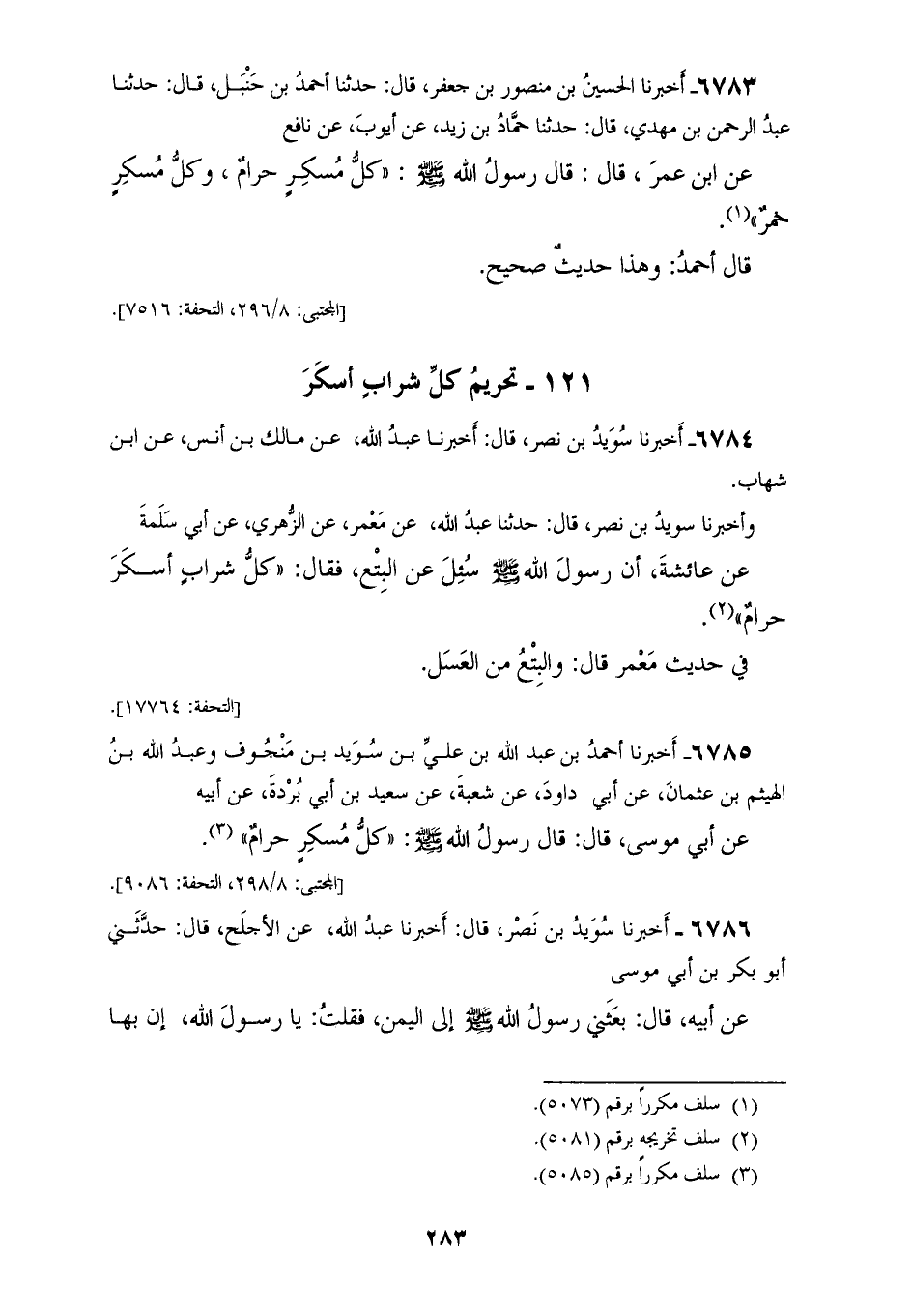 6783 - أَخْبَرَنَا الْحُسَيْنُ بْنُ مَنْصُورِ بْنِ جَعْفَرٍ، قَالَ: حَدَّثَنَا أَحْمَدُ بْنُ حَنْبَلٍ، قَالَ: حَدَّثَنَا عَبْدُ الرَّحْمَنِ بْنُ مَهْدِيٍّ، قَالَ: حَدَّثَنَا حَمَّادُ بْنُ زَيْدٍ، عَنْ أَيُّوبَ، عَنْ نَافِعٍ، عَنِ ابْنِ عُمَرَ، قَالَ: قَالَ رَسُولُ اللهِ صَلَّى اللهُ عَلَيْهِ وَسَلَّمَ: «§كُلُّ مُسْكِرٍ حَرَامٌ، وَكُلُّ مُسْكِرٍ خَمْرٌ» قَالَ أَحْمَدُ: وَهَذَا حَدِيثٌ صَحِيحٌ
