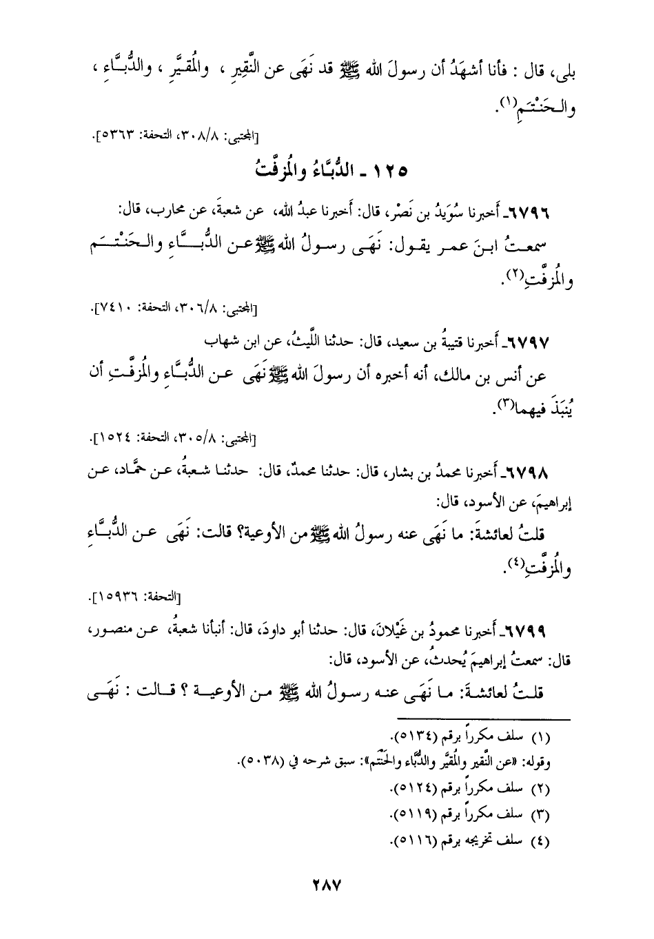 6796 - أَخْبَرَنَا سُوَيْدُ بْنُ نَصْرٍ، قَالَ: أَخْبَرَنَا عَبْدُ اللهِ، عَنْ شُعْبَةَ، عَنْ مُحَارِبٍ، قَالَ: سَمِعْتُ ابْنَ عُمَرَ، يَقُولُ: «§نَهَى رَسُولُ اللهِ صَلَّى اللهُ عَلَيْهِ وَسَلَّمَ عَنِ الدُّبَّاءِ، وَالْحَنْتَمِ، وَالْمُزَفَّتِ»