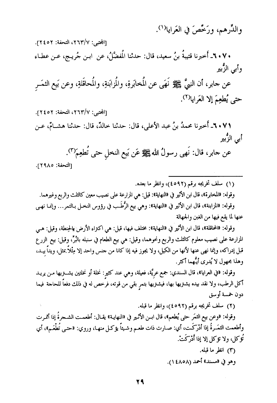 6070 - أَخْبَرَنَا قُتَيْبَةُ بْنُ سَعِيدٍ، قَالَ: حَدَّثَنَا الْمُفَضَّلُ، عَنِ ابْنِ جُرَيْجٍ، عَنْ عَطَاءٍ، وَأَبِي الزُّبَيْرِ، عَنْ جَابِرٍ، أَنَّ النَّبِيَّ صَلَّى اللهُ عَلَيْهِ وَسَلَّمَ نَهَى §عَنِ الْمُخَابَرَةِ، وَالْمُزَابَنَةِ، وَالْمُحَاقَلَةِ، وَعَنْ بَيْعِ الثَّمَرِ حَتَّى يُطْعَمَ إِلَّا الْعَرَايَا