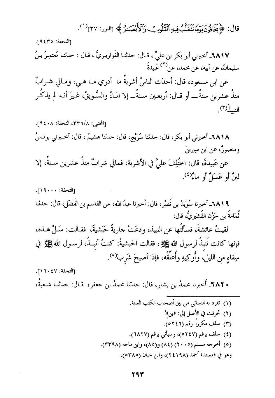 6817 - أَخْبَرَنِي أَبُو بَكْرِ بْنُ عَلِيٍّ، قَالَ: حَدَّثَنَا الْقَوَارِيرِيُّ، قَالَ: حَدَّثَنَا مُعْتَمِرُ بْنُ سُلَيْمَانَ، عَنْ أَبِيهِ، عَنْ مُحَمَّدِ، عَنْ عَبِيدَةَ، عَنِ ابْنِ مَسْعُودٍ، قَالَ: أَحْدَثَ النَّاسُ أَشْرِبَةً، مَا أَدْرِي مَا هِيَ، وَمَا لِي شَرَابٌ مُنْذُ عِشْرِينَ سَنَةً، أَوْ قَالَ: «§أَرْبَعِينَ سَنَةً إِلَّا الْمَاءَ وَالسَّوِيقَ، غَيْرَ أَنَّهُ لَمْ يَذْكُرِ النَّبِيذَ»
