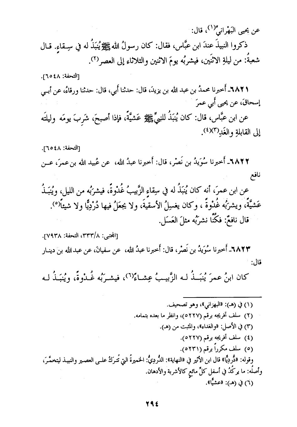 6822 - أَخْبَرَنَا سُوَيْدُ بْنُ نَصْرٍ، قَالَ: أَخْبَرَنَا عَبْدُ اللهِ، عَنْ عُبَيْدِ اللهِ بْنِ عُمَرَ، عَنْ نَافِعٍ، عَنِ ابْنِ عُمَرَ: «أَنَّهُ كَانَ §يُنْبَذُ لَهُ فِي سِقَاءٍ لِلزَّبِيبِ غُدْوَةً، فَيَشْرَبُهُ مِنَ اللَّيْلِ، وَيُنْبَذُ عَشِيَّةً، وَيَشْرَبُهُ غُدْوَةً، وَكَانَ يَغْسِلُ الْأَسْقِيَةَ، وَلَا يُجْعَلُ فِيهَا دُرْدِيًّا، وَلَا شَيْئًا» قَالَ نَافِعٌ: فَكُنَّا نَشْرَبُهُ مِثْلَ الْعَسَلِ