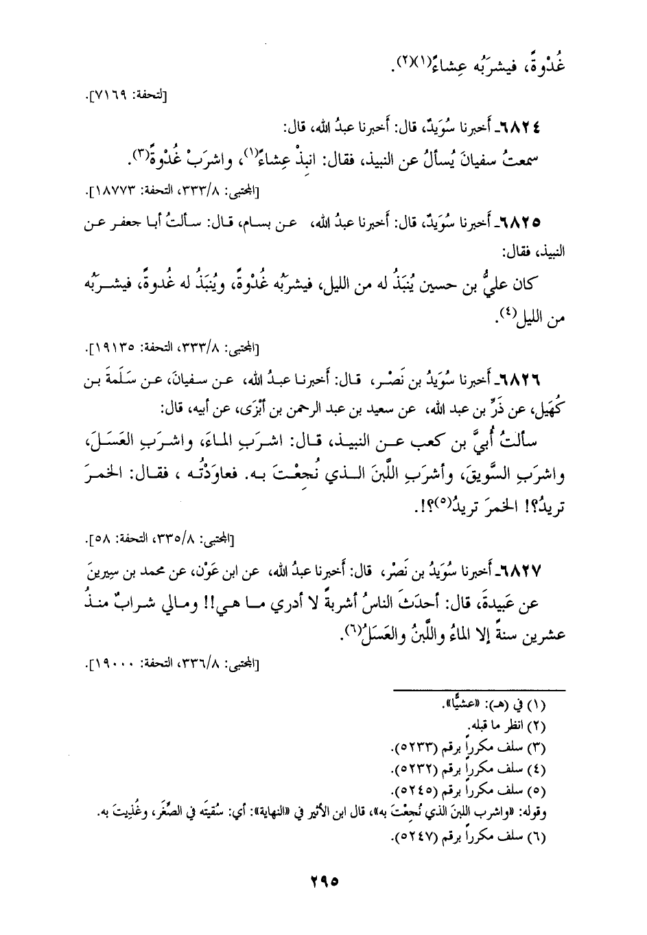 6825 - أَخْبَرَنَا سُوَيْدٌ، قَالَ: أَخْبَرَنَا عَبْدُ اللهِ، عَنْ بَسَّامٍ، قَالَ: سَأَلْتُ أَبَا جَعْفَرٍ عَنِ النَّبِيذِ فَقَالَ: كَانَ عَلِيُّ بْنُ حُسَيْنٍ: «§يُنْبَذُ لَهُ مِنَ اللَّيْلِ، فَيَشْرَبُهُ غُدْوَةً، وَيُنْبَذُ لَهُ غُدْوَةً، فَيَشْرَبُهُ مِنَ اللَّيْلِ»